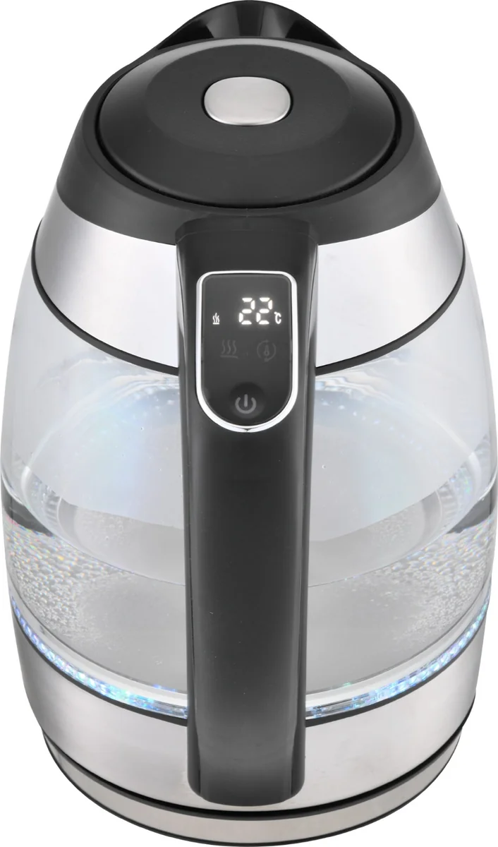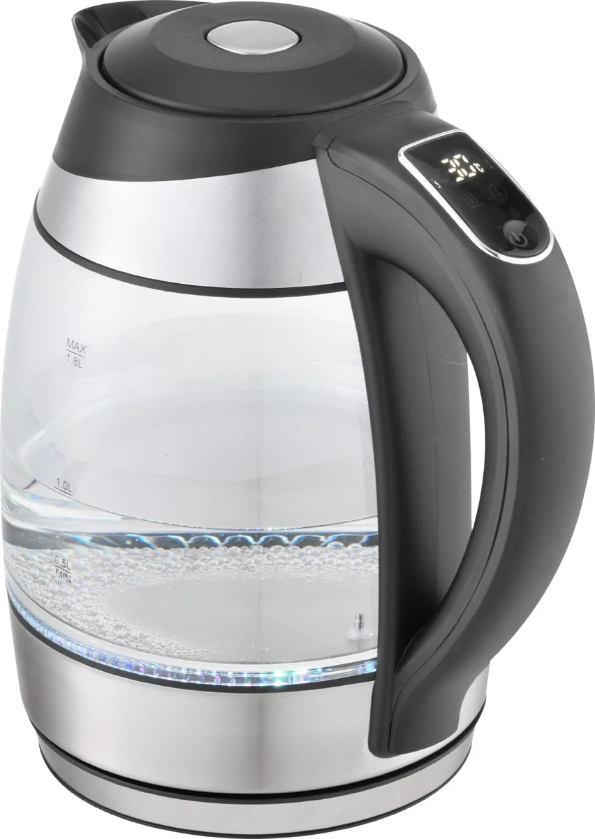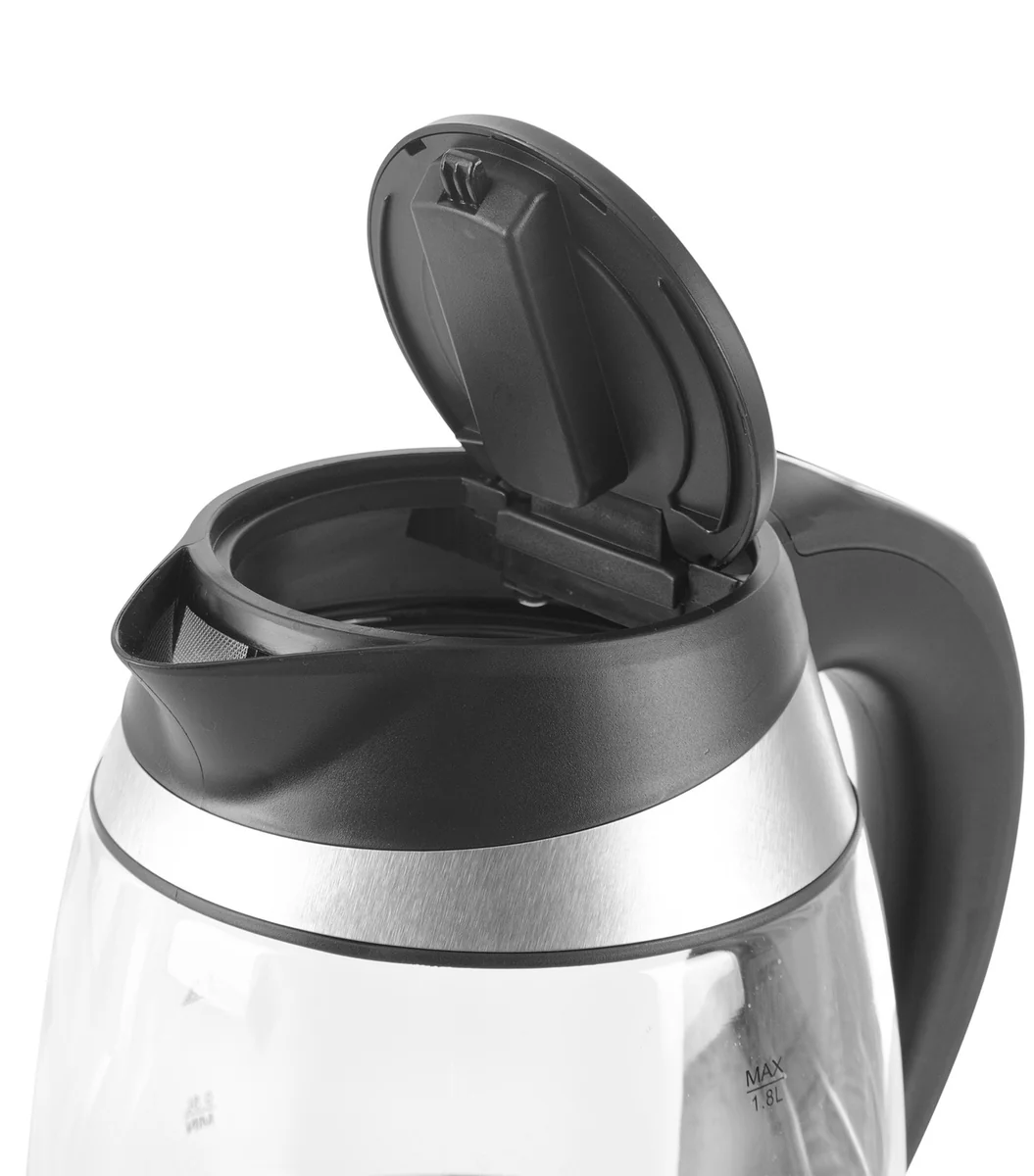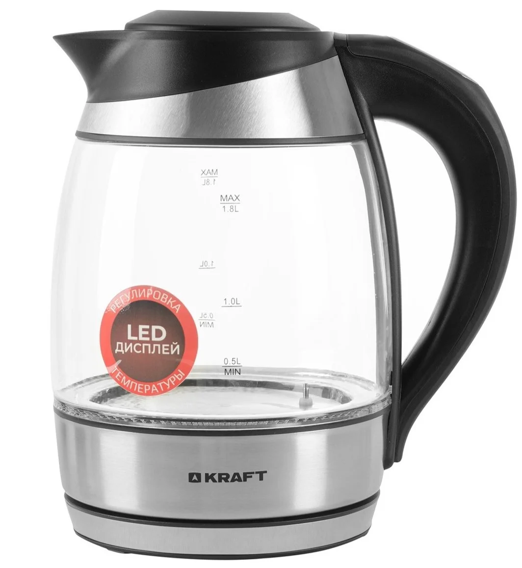 Электрический чайник KRAFT KG1804DBL из боросиликатного стекла со вставками из нержавеющей стали и черного пластика имеет мощность 2200 Вт и способен за несколько минут довести до кипения 1,8 л воды. Корпус выполнен из боросиликатного стекла, прибор имеет нейлоновый фильтр в носике. В конструкции чайника самый важный элемент – это контроллер LIANGJI, рассчитанный на 10 000 рабочих циклов. Чайник оснащен автоматическим отключением, защитой от выкипания. Модель имеет качественный механизм открытия и закрытия крышки, а также LED подсветку.