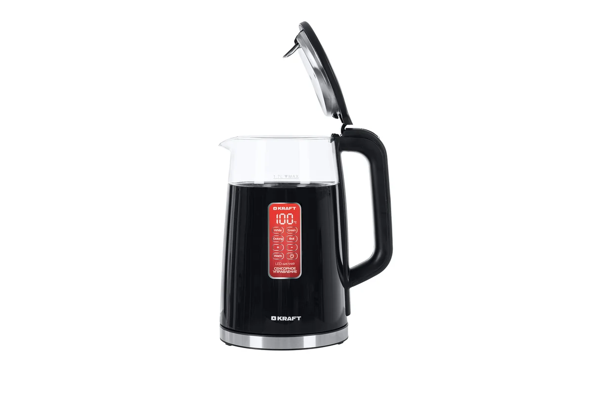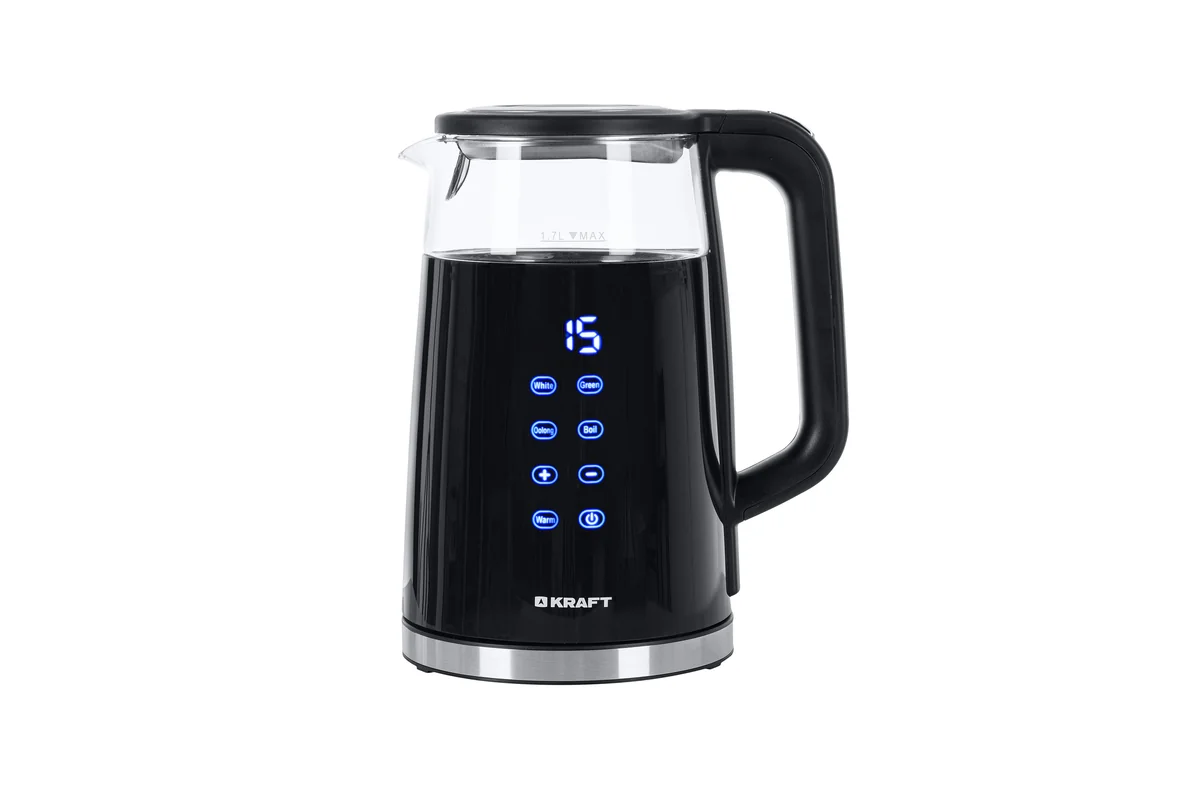 Электрический чайник KRAFT KF-KPG1711BLD в черном цвете имеет мощность 2200 Вт и способен за несколько минут довести до кипения 1,7 л воды.