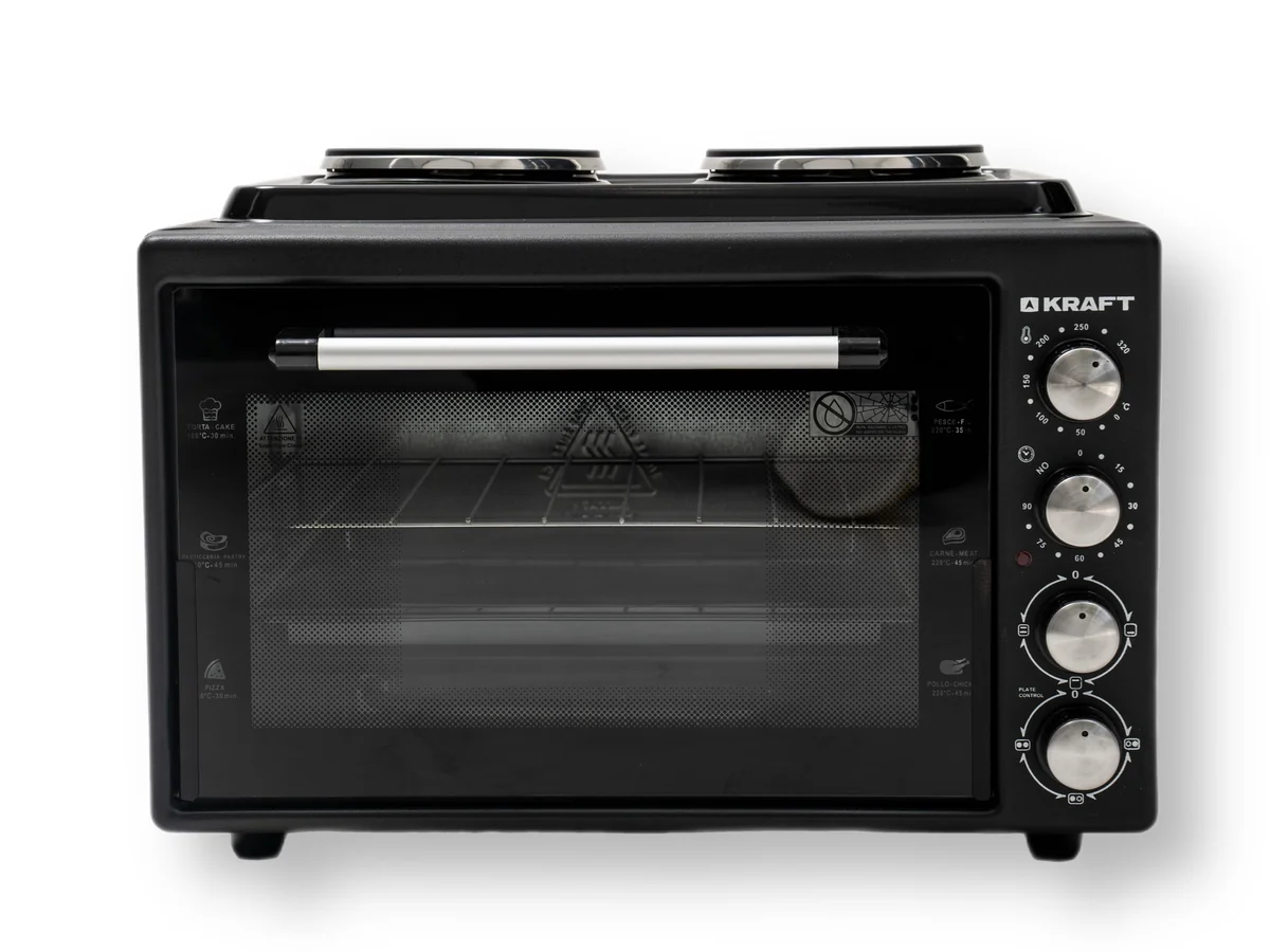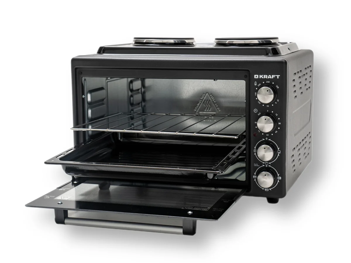 Электрическая духовка Kraft KF-MOHP3800 BL в черном цвете объемом 38 литра. Мощность прибора составляет 1500 Вт, что обеспечивает быстрый нагрев. Сверху электрическая духовка оборудована двумя конфорками, мощность каждой составляет 1000 Вт. В комплект входит глубокий прямоугольный противень и решетка.