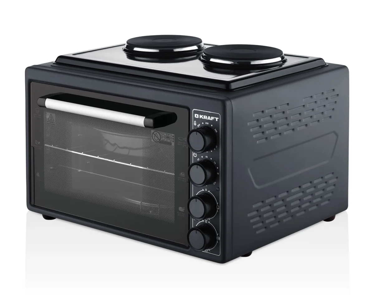 Электрическая духовка Kraft KF-MOHP3800DGR в темно-сером цвете объемом 38 литра. Мощность мини-печи составляет 1500 Вт, что обеспечивает быстрый нагрев. Сверху электрическая духовка оборудована двумя конфорками, мощность каждой составляет 1000 Вт. В комплект входит глубокий прямоугольный противень и решетка.