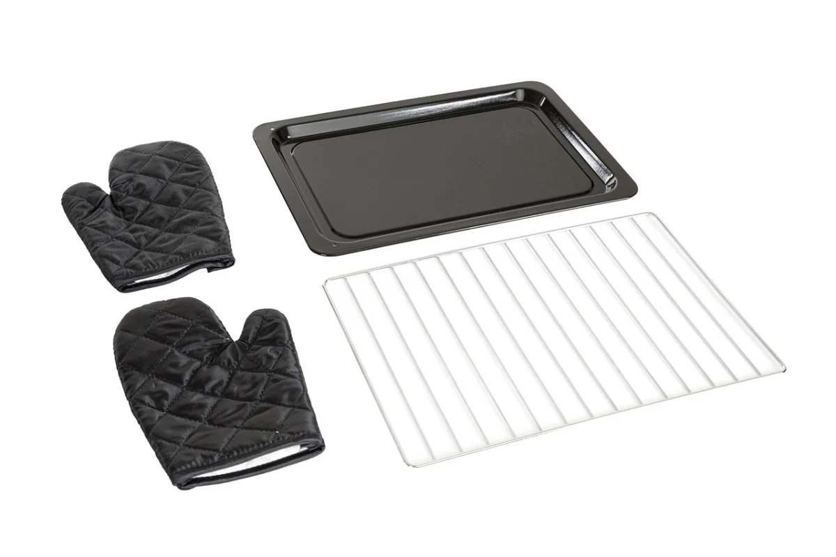 В комплект входят: прямоугольный противень, прихваты и решетка.