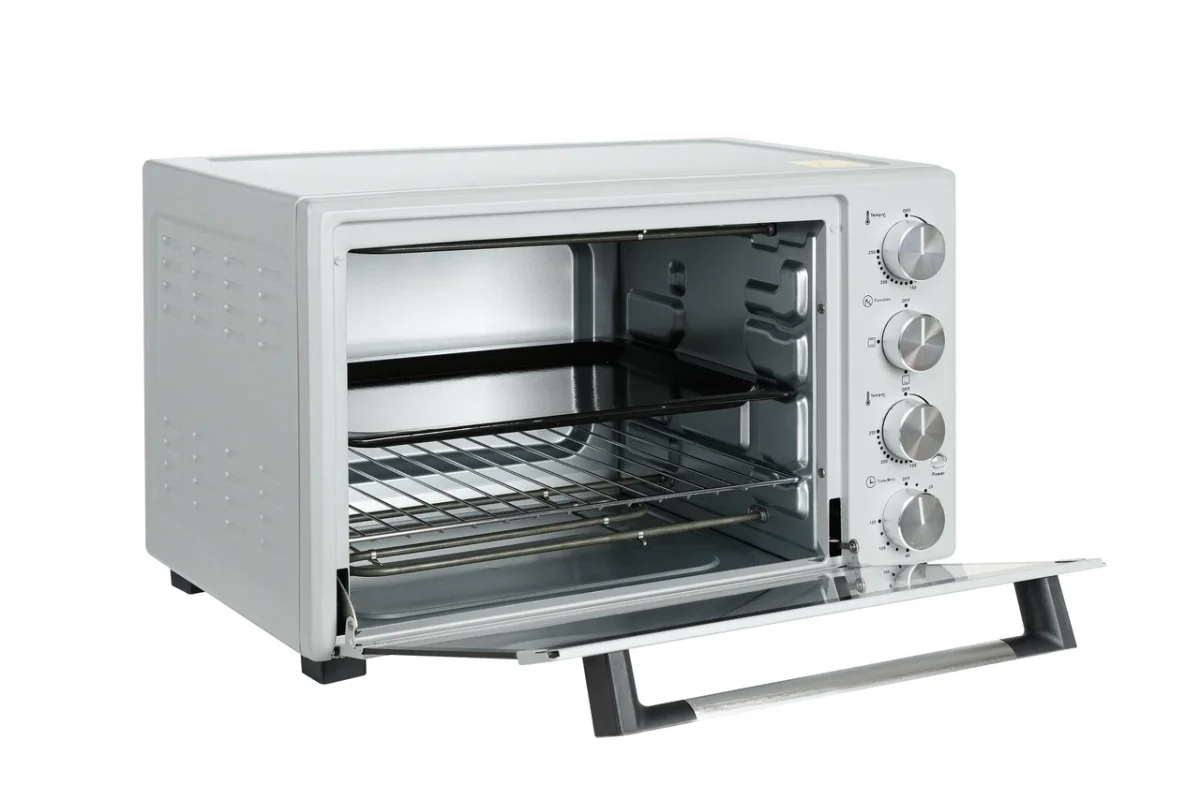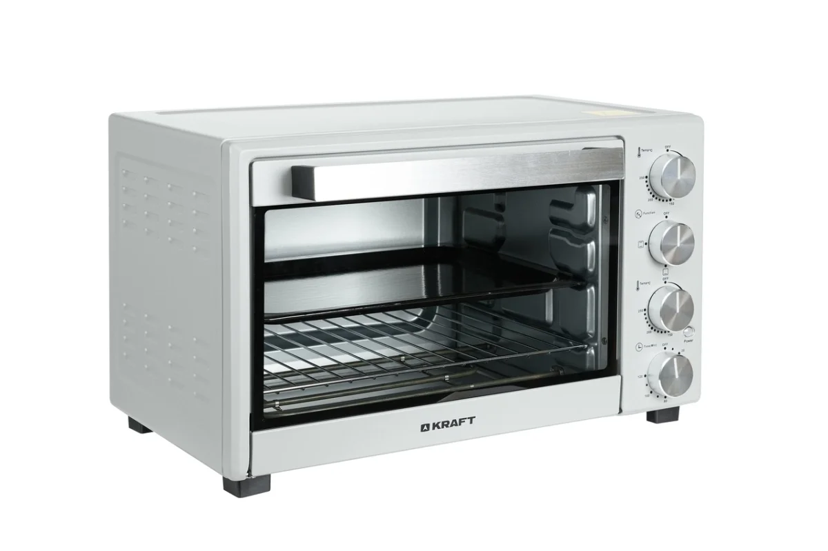 Мини-печь KRAFT объёмом 38 литров. Мини-печь работает в 3 автоматических режимах, с помощью которых можно приготовить и разогреть разнообразные блюда. Мощность 1600 Вт обеспечивает быстрый нагрев. Максимальная температура нагрева 250 C и хорошая теплоизоляция подходит для выпечки хлеба, мясных и рыбных блюд. Поворотные переключатели способствуют быстрому выбору и легкой установке параметров готовки. Благодаря дверце из закаленного стекла вы с легкостью сможете контролировать приготовление блюда. Таймер со звуковым сигналом уведомляет о завершении процесса.