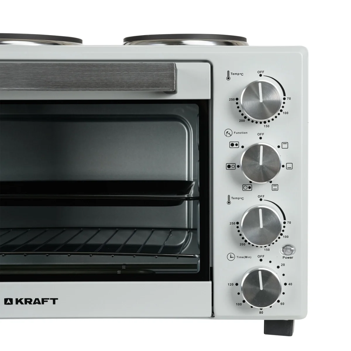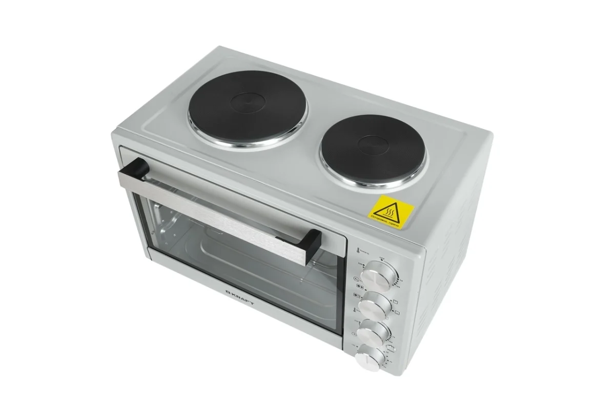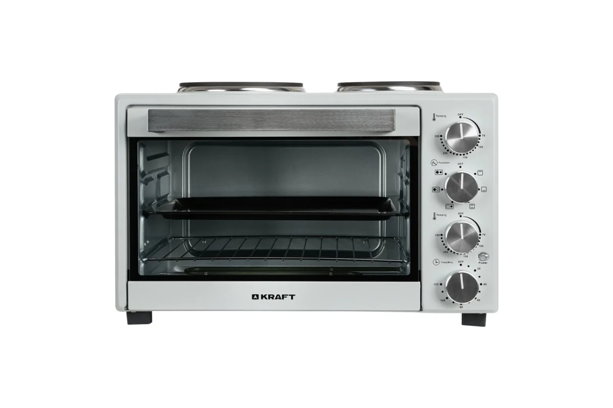 Электрическая духовка Kraft KF-MOHP 380 HGR в сером цвете объемом 38 литра. Мощность мини-печи составляет 1600 Вт, что обеспечивает быстрый нагрев. Сверху электрическая духовка оборудована двумя конфорками с мощность 600 Вт и 1000 Вт. В комплект входит глубокий прямоугольный противень и решетка.