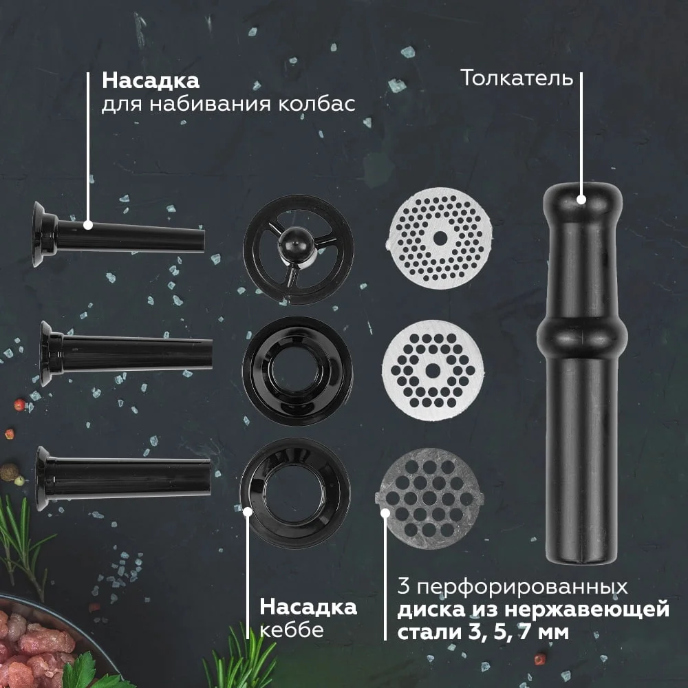 В комплект входят три перфорированных диска разного диаметра, алюминиевый лоток, а также насадки для набивания колбас, насадка для кеббе, толкатель.