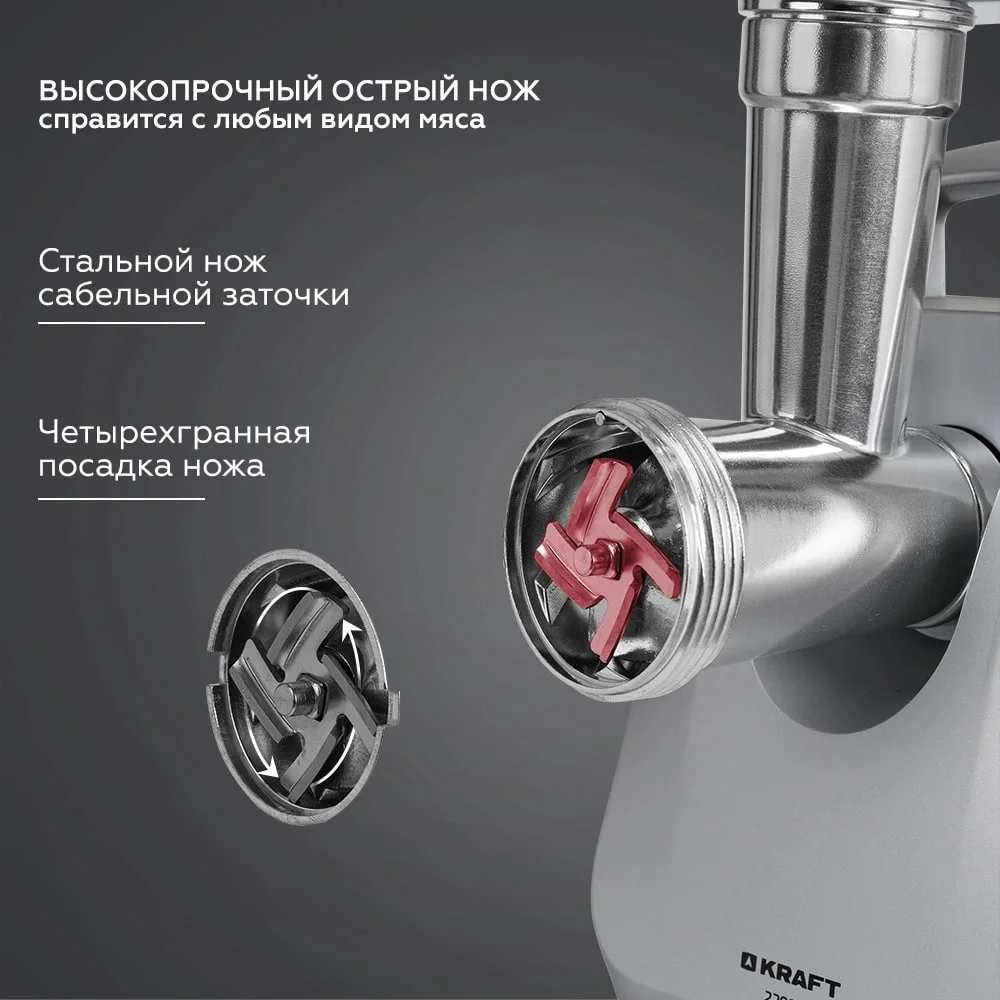 Электрическая мясорубка KF-MG2201BL мощностью 2200 Вт способна перерабатывать до 2,7 килограммов продуктов в минуту. Корпус мясорубки выполнен из прочного пластика.