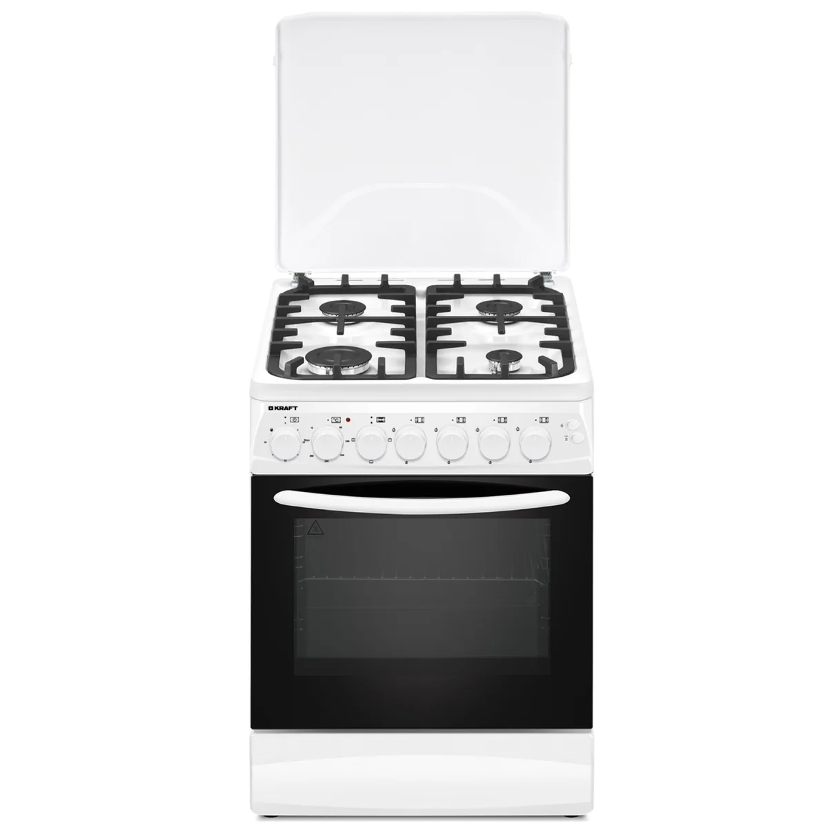 Комбинированная плита Kraft KF-FSK6407AEWI оснащена конфорками фирмы SABAF (Италия). Управление подачей газа осуществляется удобными поворотными переключателями. Автоподжиг функционирует как на варочной панели, так и в духовке, для его включения достаточно лишь зажать кнопку. Электрическая духовка имеет объем 70 литров. Модель оснащена металлической крышкой с быстросъемным механизмом, поэтому крышку легко снять и помыть. В комплекте противень и решетка.