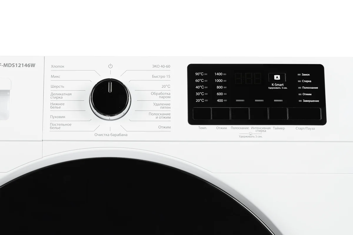 Стиральная машина KF-MDS12146W с загрузкой белья до 12 кг оснащена 15 программами стирки, максимальная скорость отжима составляет 1400 оборотов в минуту. Модель обладает функцией отложенного старта, системой защиты от перелива и блокировкой от детей, автоматическим перераспределением белья, контролем пенообразования, а также обработкой пара.