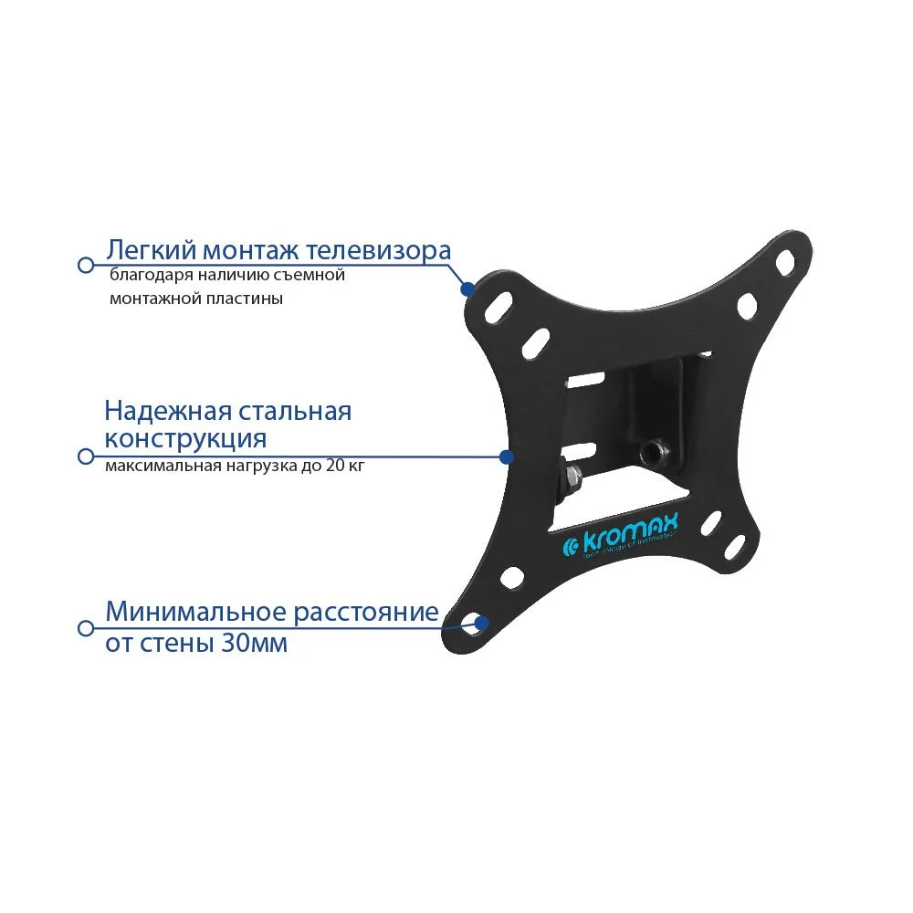 | Дополнительно: | Легкий монтаж телевизора благодаря наличию съемной монтажной пластины Надежная стальная конструкция максимальная нагрузка до 20 кг Минимальное расстояние от стены 30 мм |