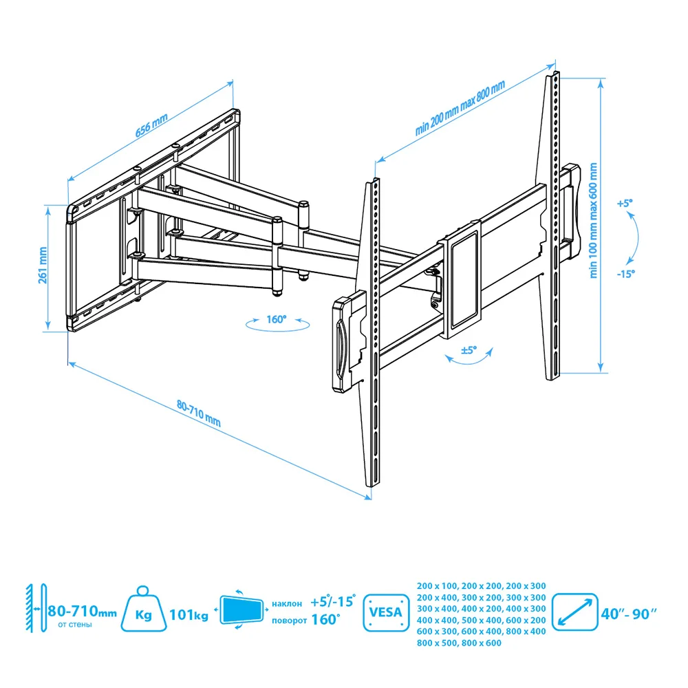 KROMAX ATLANTIS-75 BLACK надёжно удержит экран размером 40"-90" дюйма и весом 101 кг. Простая конструкция KROMAX ATLANTIS-75 BLACK идеально подойдет для самостоятельного монтажа. Наклонно-поворотная регулировка позволит наклонять вверх и вниз на +5 -15°, поворачивать влево и вправо на 160°, и выдвигать на 80-710 мм.