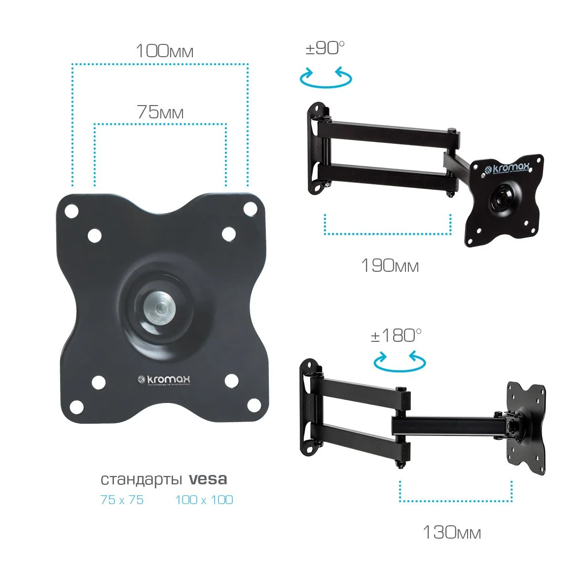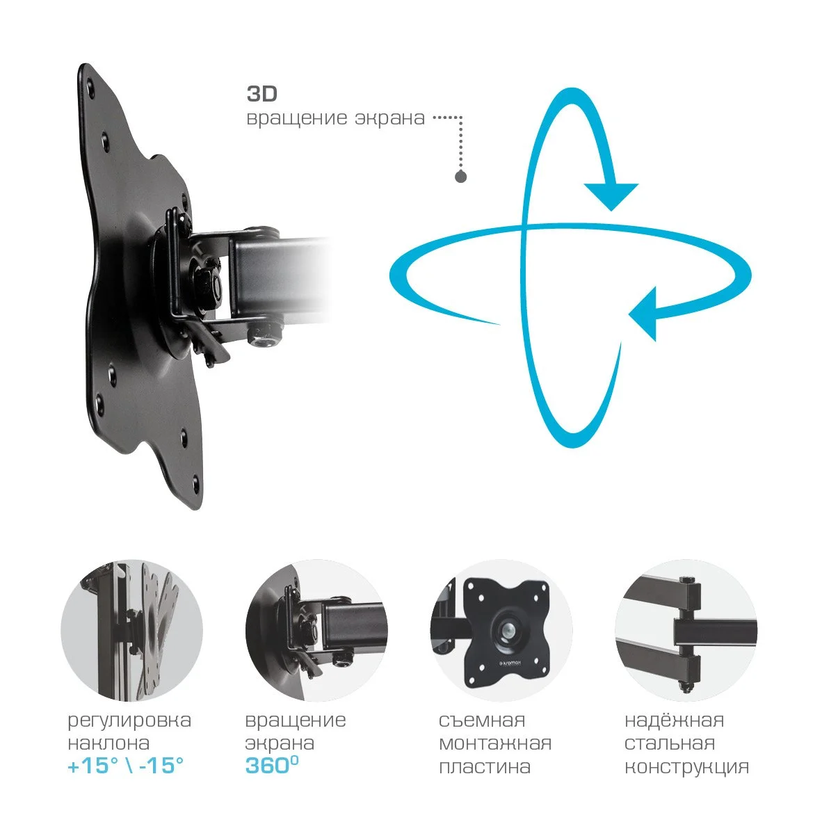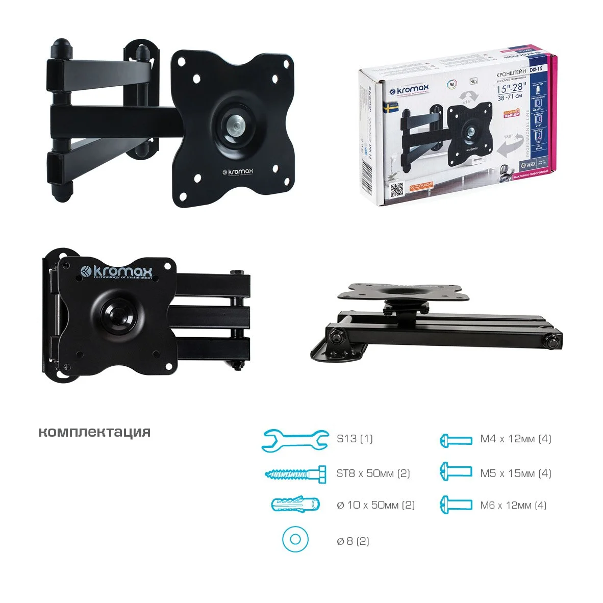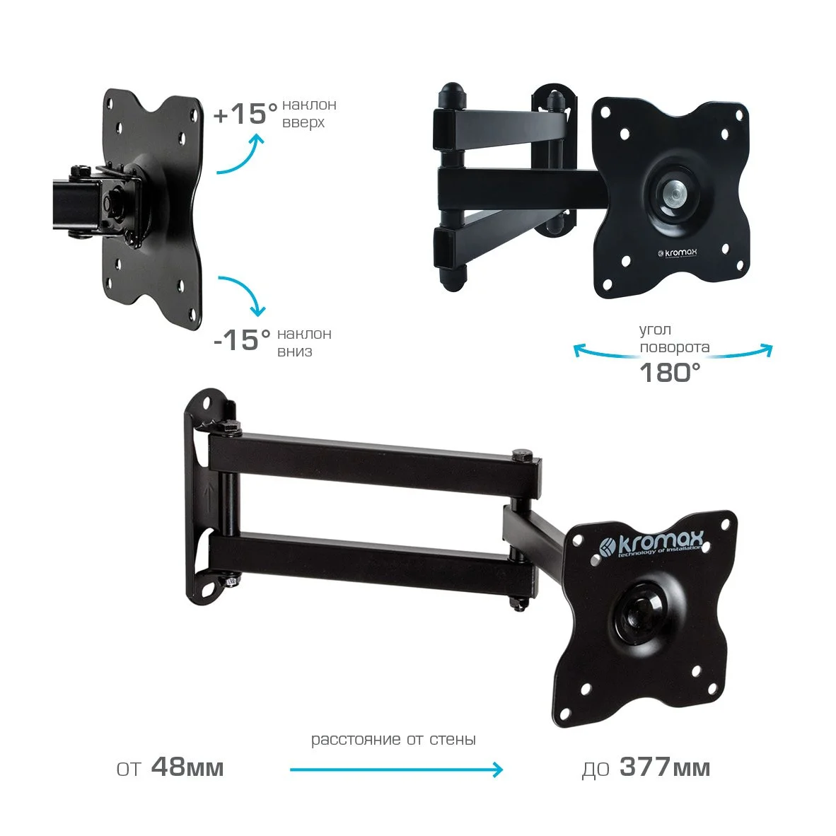 | Дополнительно | Надежная стальная конструкция, Максимальная степень подвижности, Минимальное расстояние до стены в сложенном виде 48 мм, 3D вращение экрана, Съемная монтажная пластина |