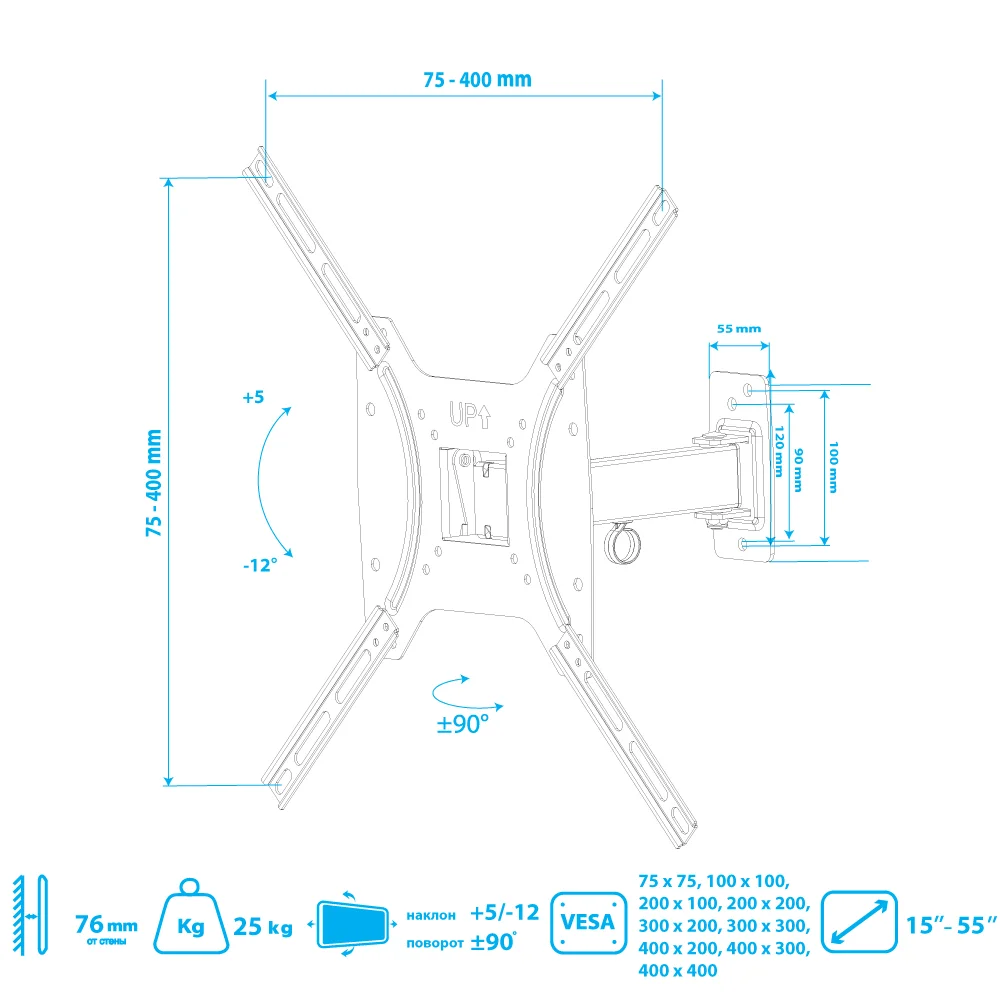 Настенный наклонно-поворотный кронштейн для телевизоров и мониторов с диагональю от 15 до 55 дюймов.