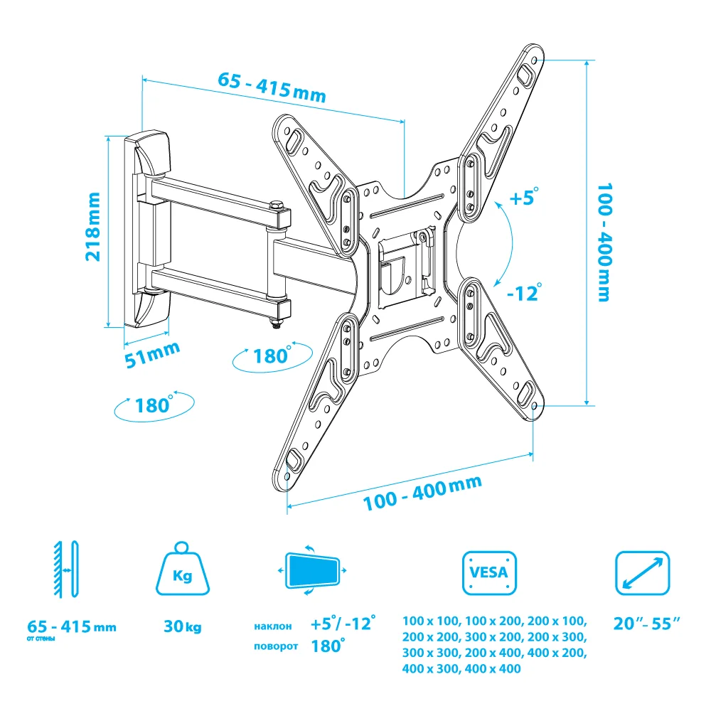 KROMAX OPTIMA-414 BLACK надёжно удержит экран размером 20"-55" дюйма и весом 30 кг. Простая конструкция KROMAX OPTIMA-414 BLACK идеально подойдет для самостоятельного монтажа. Наклонно-поворотная регулировка позволит наклонять вверх и вниз на +5 -12°, поворачивать влево и вправо на 180°, и выдвигать на 65-415 мм.