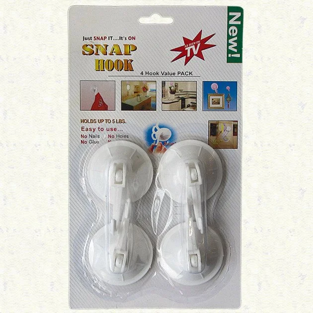 Крючок вакуумный. Вакуумный крючок выполнен из пластика и имеет стандартный дизайн. С помощью фиксатора под крючком создается вакуум, это позволяет крючку держатся еще крепче на ровной поверхности, не оставляя следов от присоски.