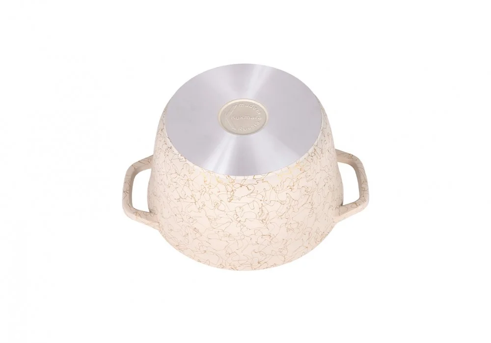 Кастрюля Kukmara с антипригарным покрытием имеет проточенное дно, которое обеспечивает максимальное прилегание дна посуды к плите для более быстрого и равномерного нагрева.