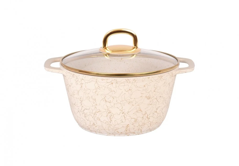 Оригинальная отделка внешней поверхности с помощью золотых и серебряных нитей, придающих посуде особое изящество и богатство, а так же уникальное внутреннее противопригорающее покрытие, обладающее исключительными антипригарными свойствами, прочностью и износостойкостью, не содержит PFOA, кадмий, свинец и полностью безопасно. Высокая прочность антипригарного покрытия позволяет использовать неострые кухонные металлические принадлежности.