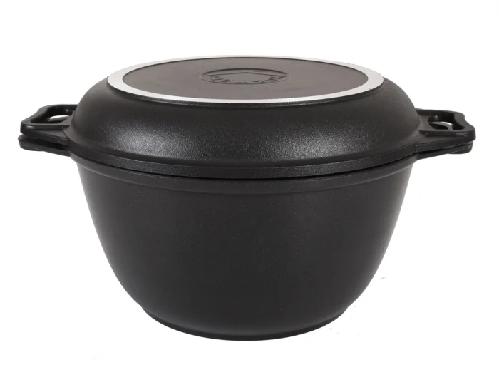 Казан с крышкой-сковородой Kukmara хорошо подходит для варки, тушения и томления, так как имеет отличные теплораспределительные и теплоаккумулирующие свойства, и блюда в ней получаются сочными и ароматными. Цельнолитые ручки позволяют использовать кастрюлю в духовом шкафу.