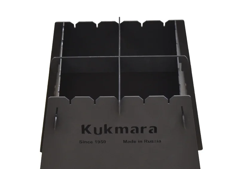 Походная печь Kukmara прекрасно подойдет тем, кто любит путешествовать налегке, кому важно сэкономить место при хранении и транспортировке. Конструкция печи является многофункциональной: подходит и для разогрева, и для приготовления пищи, кипячения воды, обогрева. Для приготовления можно использовать любую металлическую посуду. Устойчивое расположение посуды достигается подставкой, которой снабжена печь, состоящей из двух секций, которые вкладываются в пазы в верхних частях стенок.