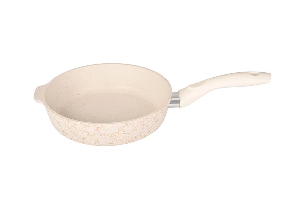 Сковорода Kukmara с антипригарным покрытием имеет проточенное дно, которое обеспечивает максимальное прилегание дна посуды к плите для более быстрого и равномерного нагрева.