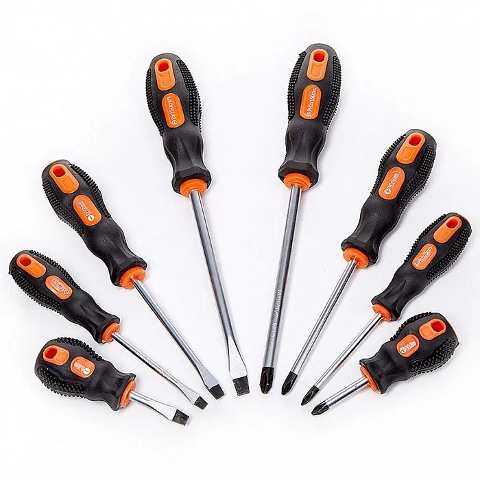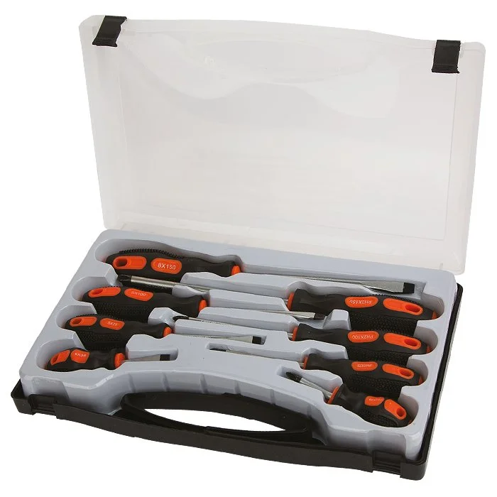 - отвертки с прямым шлицем 4 штуки: 6х38 мм; 5х75 мм; 6х100 мм; 8х150 мм