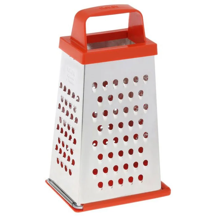 - Терка универсальная 4-гранная трапециевидная из белой жести со съемным дном и с пластиковой ручкой