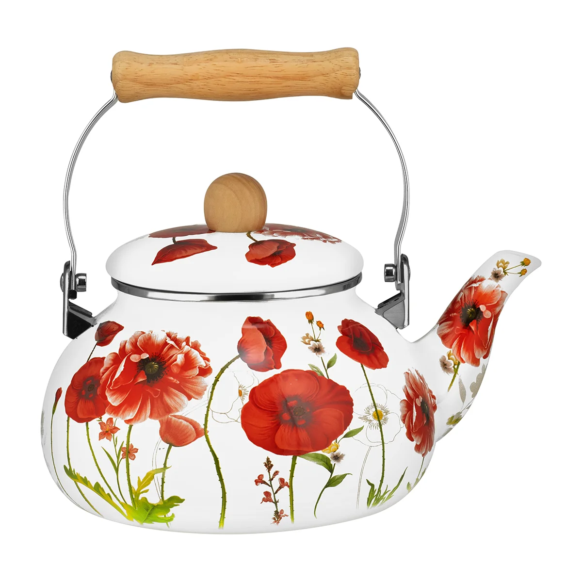 Классический эмалированный чайник LARA с элегантным дизайном и декорированием деколью – это практичный и экологичный помощник на вашей кухне. Эмалевое покрытие дольше сохраняет тепло. Чайник с цветочным орнаментом украсит кухонный интерьер. Широкая горловина для удобного залива воды. Чайник изготовлен из качественной углеродистой стали. Корпус покрыт трехслойным эмалированным покрытием внутри и снаружи. Эмаль устойчива к бактериям, легко моется и не впитывает посторонние запахи. Удобная складная ручка выполнена из нержавеющей стали и имеет ненагревающуюся вставку из древесины. Индукционное дно подходит для всех типов кухонных плит.