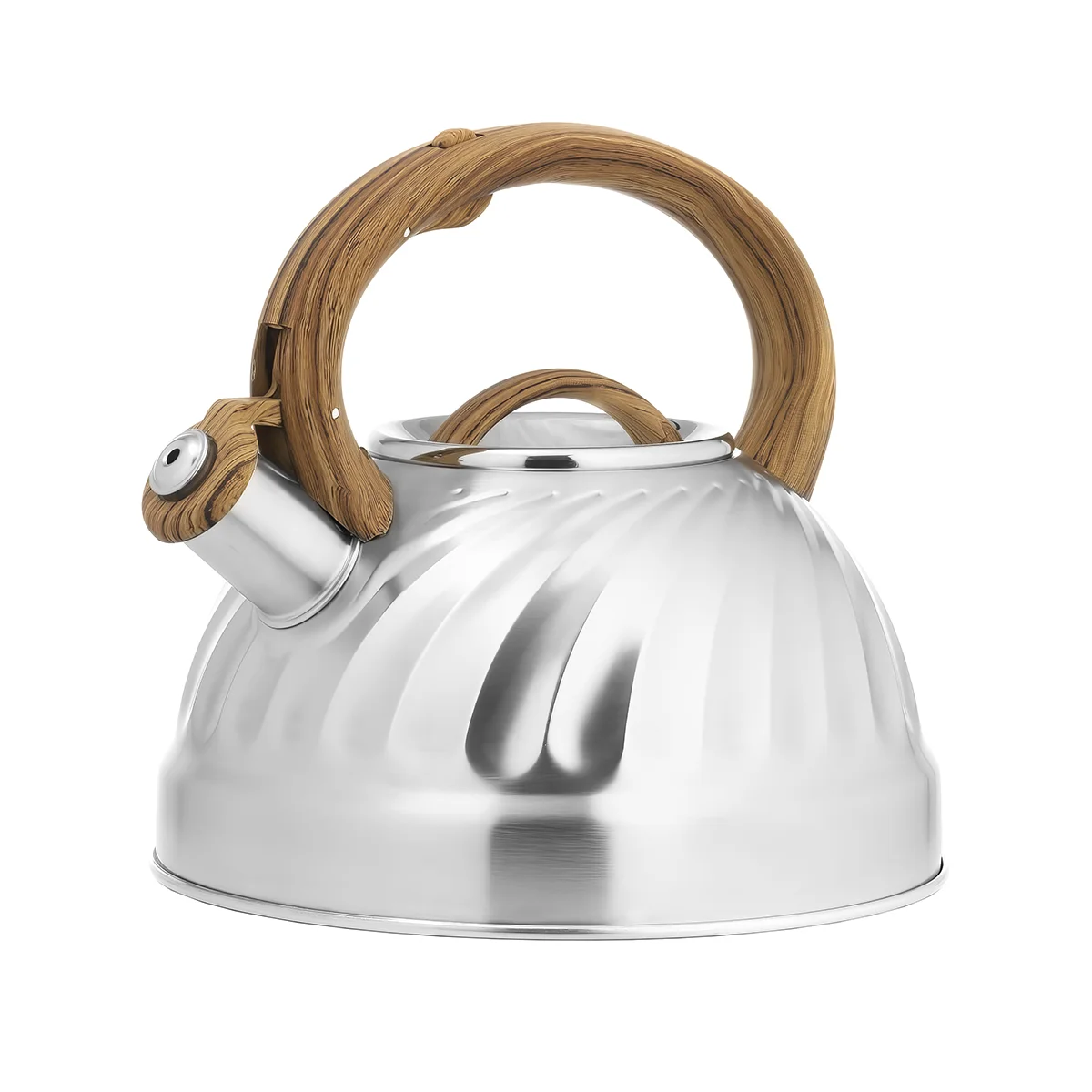 Чайник со свистком LARA классической формы с рельефным декором корпуса станет настоящим помощник на вашей кухне. Он без проблем вскипятит необходимый объем воды, а свисток не позволит пропустить момент закипания. Эргономичная ручка с механизмом открывания свистка позволит безопасно использовать его одной рукой. Чайник изготовлен из высококачественной нержавеющей стали с комбинированной матовой и зеркальной отделкой корпуса. Ненагревающиеся пластиковые ручки окрашены под дерево и имеют приятное на ощупь силиконовое покрытие Soft-touch. Толстое индукционное капсулированное дно подходит для использования на всех типах плит.