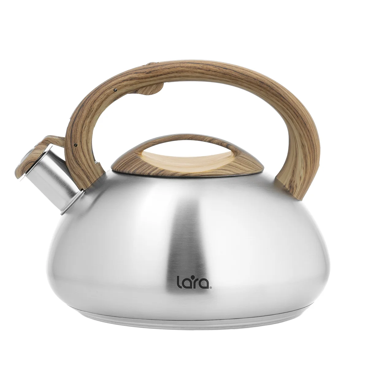 Современный чайник LARA округлой формы с матовой отделкой корпуса станет вашим незаменимым помощником на каждый день. Установленный свисток не позволит пропустить момент закипания воды, и вы вовремя снимите чайник с плиты. Чайник изготовлен из экологически чистых и безопасных материалов. Корпус выполнен из высококачественной нержавеющей стали. Ненагревающиеся пластиковые ручки окрашены под дерево и имеют приятное на ощупь силиконовое покрытие Soft-touch. Индукционное капсулированное дно подходит для плит всех типов. Свисток с безопасным кнопочным механизмом на ручке.
