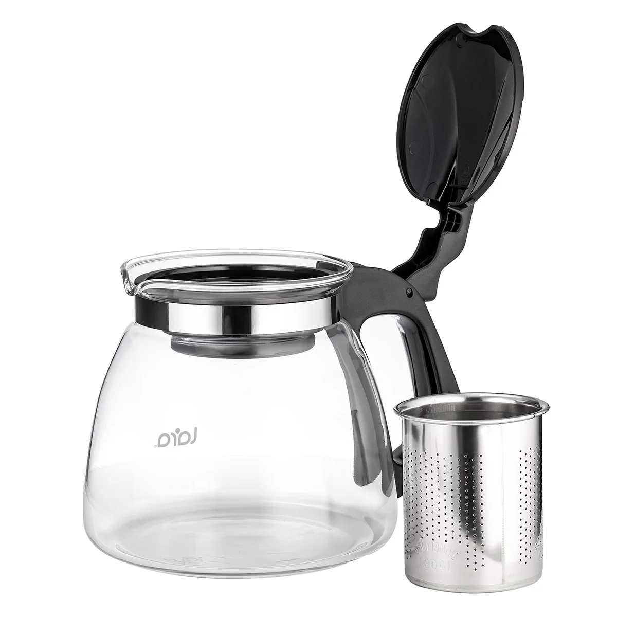 Современный внешний вид заварочного чайника LARA доставит массу удовольствия во время использования. Объема чаши достаточно, чтобы провести вечер за чашкой ароматного напитка одному или в компании единомышленников. Отлично подходит для мелколистового и крупнолистового видов чая. Для изготовления этого чайника мы выбрали экологически чистые материалы, которые не вступаю в реакцию с приготавливаемым напитком. Для колбы мы использовали жаропрочное стекло, а для стильной крышки и ручки – пищевой пластик черного цвета. Съемный жесткий фильтр для заваривания из нержавеющей стали легко чистить и использовать вновь. Отделка хромированным кольцом из нержавеющей стали.