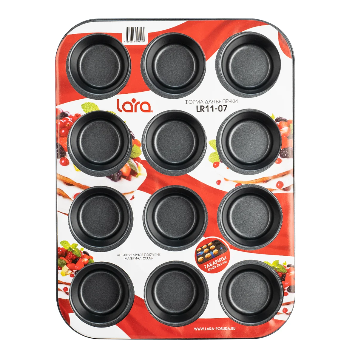 Прямоугольная форма для выпечки кексов LARA – это отличный вариант для одновременного приготовления 12 порций в духовом шкафу. Корпус выполнен из прочной и экологически чистой углеродистой стали с устойчивым антипригарным покрытием. Тесто не пригорит и вы сможете без проблем извлечь готовый продукт. Форма отлично подходит для выпечки маффинов, капкейков, брауни или порционных закусок. Обязательно экспериментируйте с составом и начинками, доставляйте радость себе и близким. Простой уход с возможностью мыть в посудомоечной машине добавляют плюсов к выбору этого кухонного аксессуара.