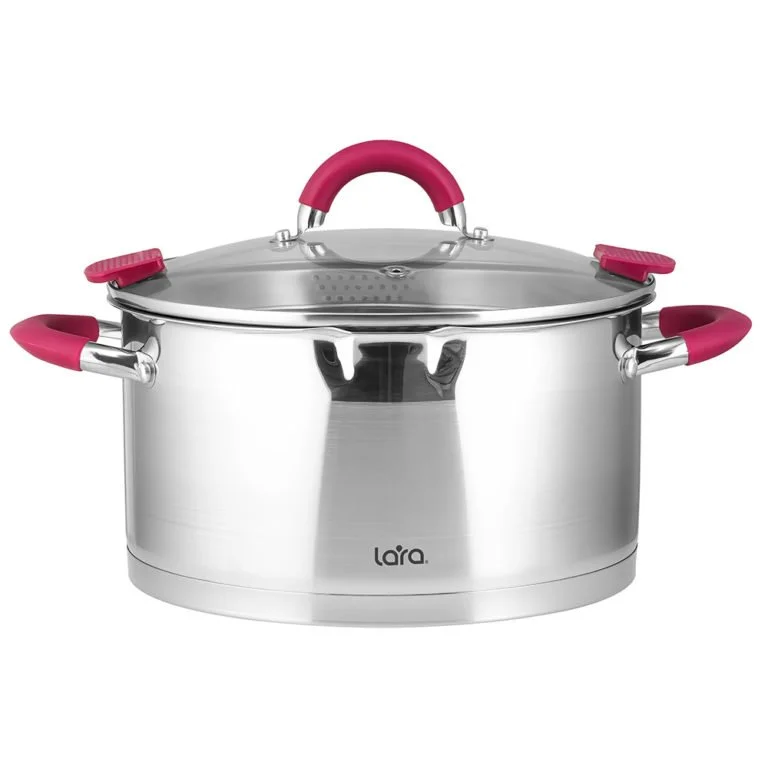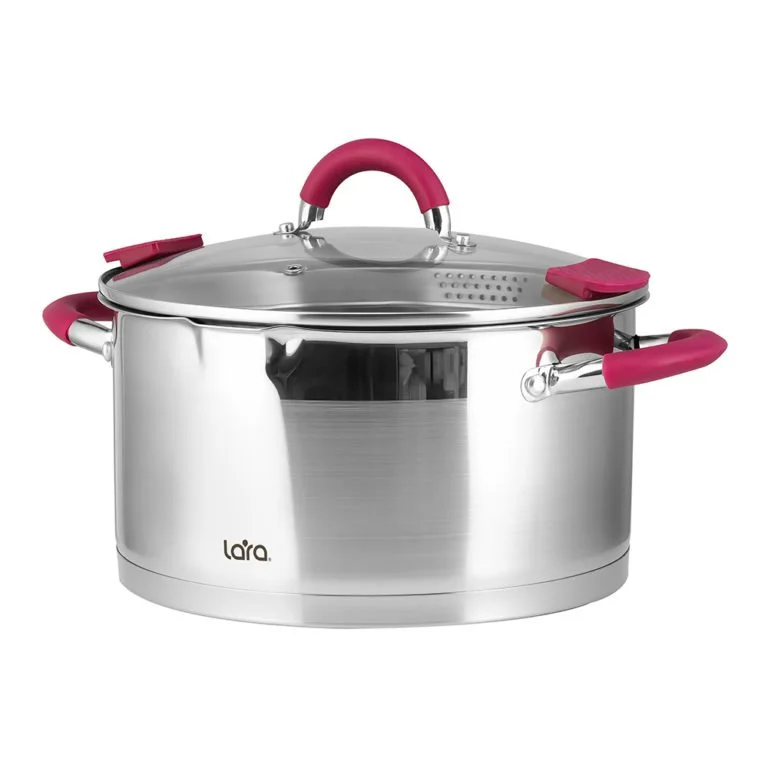 Линейка современных кастрюль LARA серии “VIVA” запросто дополнить интерьер Вашей кухни, добавит современного стиля и станет главной помощницей на ней. Оригинальный дизайн прямой формы с комбинированной полировкой и отделкой бордового цвета не оставит равнодушной ни одну хозяйку. Кастрюли выполнены из высококачественной нержавеющей стали AISI201, термостойкого стекла и ненагревающегося силикона на ручках. Главными особенностями серии являются уникальная конструкция крышки с отверстиями Ø3 Ø6 мм и силиконовые накладки, которые позволяющей легко и просто слить воду. Толстое индукционное капсулированное дно подходит для всех типов плит.