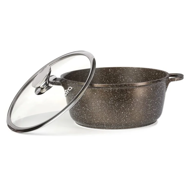 Мрамор – это идеальный акцент в дизайне, а кастрюли LARA серии “Choco” – это идеальная посуда высокого качества для ежедневного приготовления блюд. Кастрюли этой серии позволят получить не только новый опыт во взаимодействии с посудой, но и превосходный результат взаимодействия с ней. Серия выполнена из литого алюминия с прекрасными теплопроводными свойствами. Прочное антипригарное покрытие с минеральными частицами, надёжно защищает дно и стенки от повреждений. Крышка с паровыпуском изготовлена из жаропрочного стекла, защитным кольцом и удобной стальной ручкой G-формы. Капсулированное дно подходит для всех типов поверхностей.