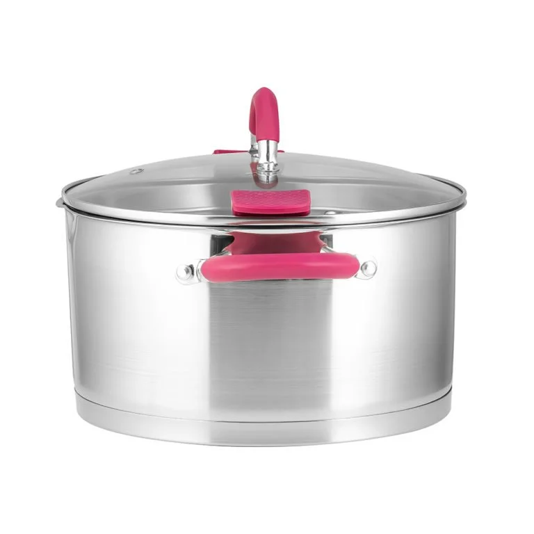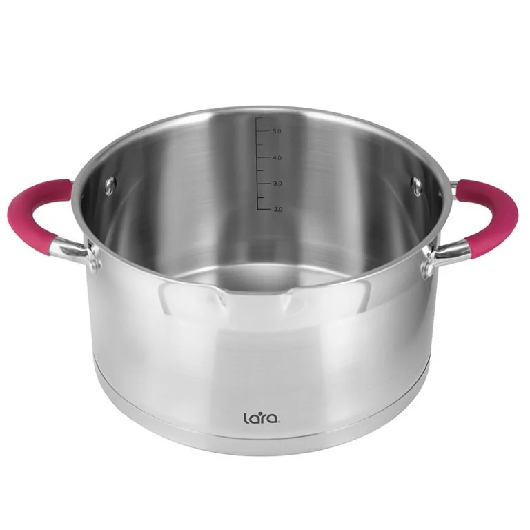 Линейка современных кастрюль LARA серии “VIVA” запросто дополнить интерьер Вашей кухни, добавит современного стиля и станет главной помощницей на ней. Оригинальный дизайн прямой формы с комбинированной полировкой и отделкой бордового цвета не оставит равнодушной ни одну хозяйку. Кастрюли выполнены из высококачественной нержавеющей стали AISI201, термостойкого стекла и ненагревающегося силикона на ручках. Главными особенностями серии являются уникальная конструкция крышки с отверстиями Ø3 Ø6 мм и силиконовые накладки, которые позволяющей легко и просто слить воду. Толстое индукционное капсулированное дно подходит для всех типов плит.