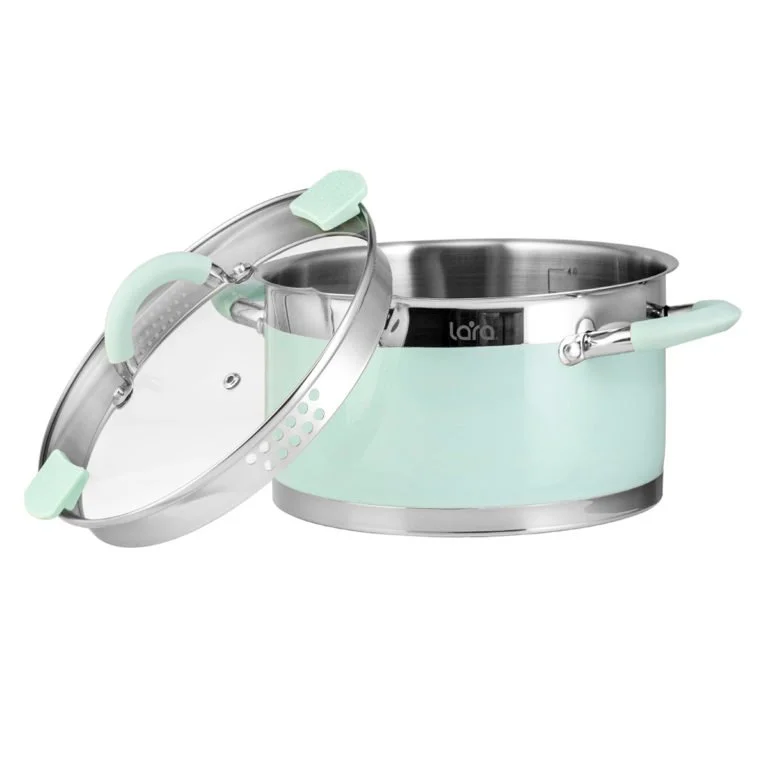 Если не знаете как освежить интерьер своей кухни, кастрюли LARA серии “MINT” помогут в этом. Они дополнят любую кухню и непременно добавят лёгкости и свежести. Оригинальный дизайн прямой формы с комбинированной полировкой и отделкой мятного цвета не оставит равнодушной ни одну хозяйку. Кастрюли выполнены из высококачественной нержавеющей стали AISI201, термостойкого стекла и ненагревающегося силикона на ручках. Главными особенностями серии являются уникальная конструкция крышки с отверстиями Ø3 Ø6 мм и силиконовые накладки, которые позволяющей легко и просто слить воду. Толстое индукционное капсулированное дно подходит для всех типов плит.