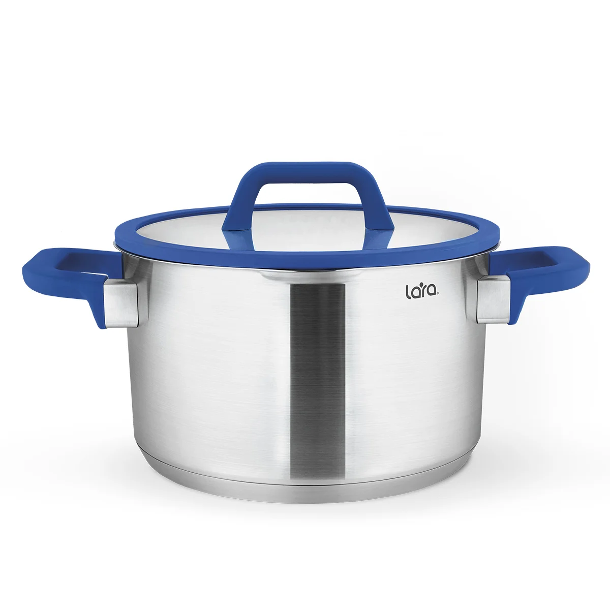 Кастрюли LARA серии «Сапфир» в современном дизайне придутся по душе любой хозяйке. На крышке есть силиконовый ободок синего цвета для повышенной фиксации ручки – это придает изделию оригинальный внешний вид и делает его стильным элементом на кухне.