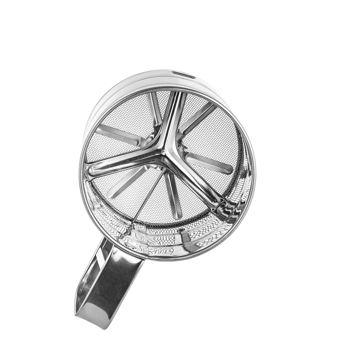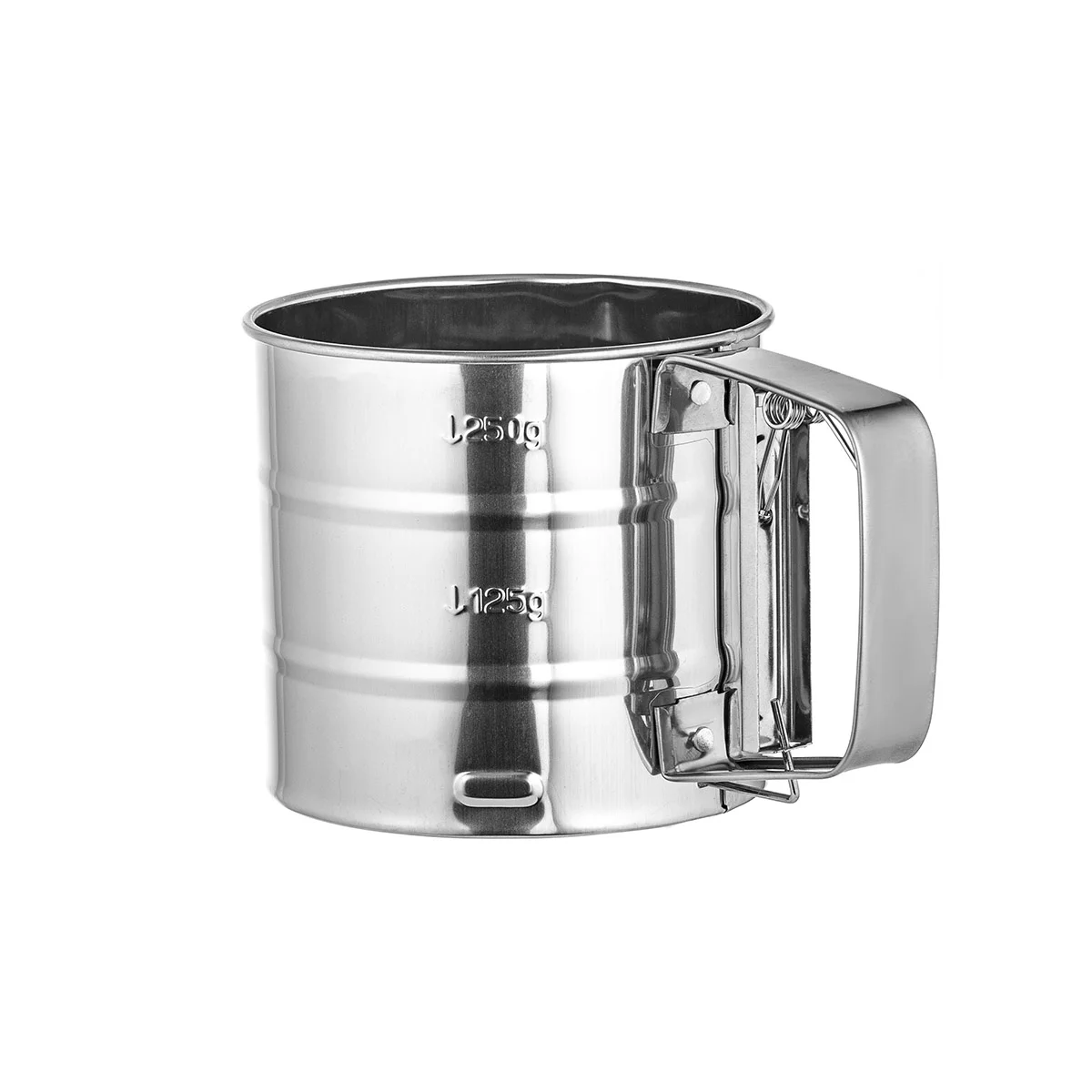 Кружка-сито – незаменимый помощник на вашей кухне. Просеивайте муку, какао, сахарную пудру и другие мелкие сыпучие продукты. Кроме просеивания и очистки, аксессуар разрыхляет, добавляя тесту воздушности. Простой механизм работы: нажатие на рычаг приводит в движение лопасти с сеткой. Рабочая поверхность изготовлена из надежной хромированной стали. Для точного соблюдения рецептуры на кружку нанесены мерные отметки.