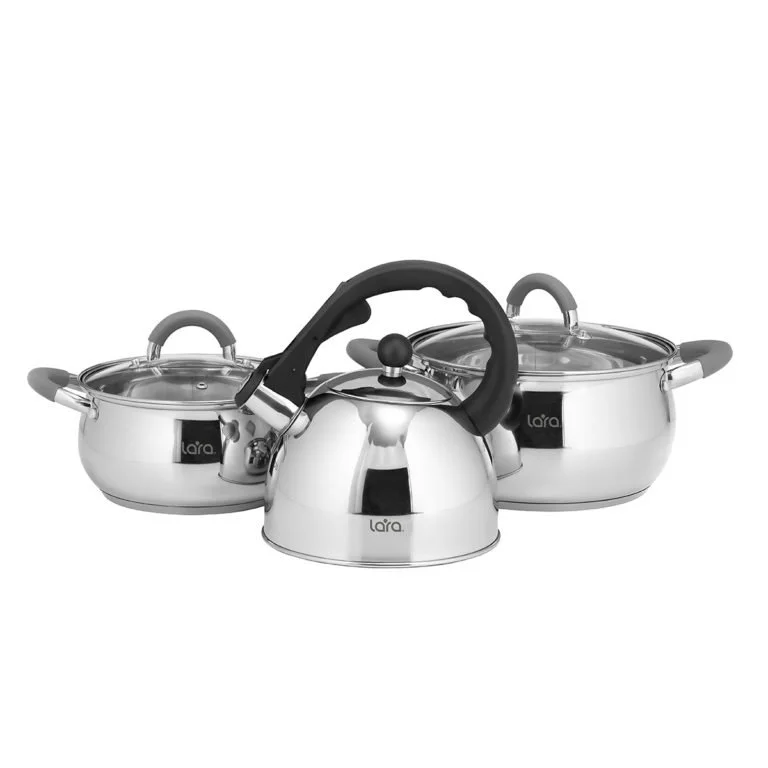 Классический набор кастрюль LARA серии “BELL” с сотейником – это понятный дизайн и безопасность в использовании. Вы точно не ошибётесь если остановите на нём свой выбор. Внутренняя мерная шкала облегчает процесс приготовления пищи и Вы сможете точно следовать выбранной рецептуре. Набор выполнен из высокоуглеродистой нержавеющей стали марки AISI201 с зеркальной полировкой. Для крышек использовали жаропрочное стекло с паровыпуском и стальным ободом C-формы плотно прилегающим к стенкам. Полые ручки на заклёпках с ненагревающимися силиконовыми накладками серого цвета. 5-слойное индукционное капсулированное дно подходит для всех типов плит.