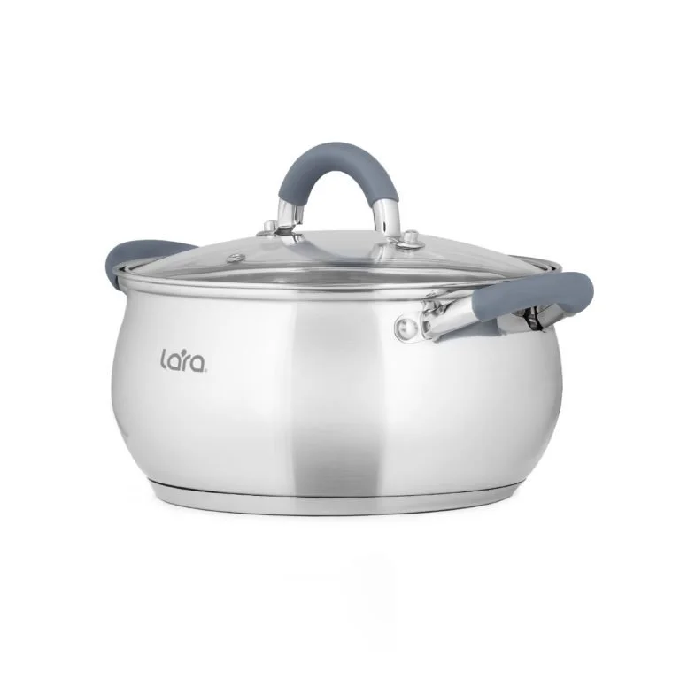 Классический набор кастрюль LARA серии “BELL” с сотейником – это понятный дизайн и безопасность в использовании. Вы точно не ошибётесь если остановите на нём свой выбор. Внутренняя мерная шкала облегчает процесс приготовления пищи и Вы сможете точно следовать выбранной рецептуре. Набор выполнен из высокоуглеродистой нержавеющей стали марки AISI201 с зеркальной полировкой. Для крышек использовали жаропрочное стекло с паровыпуском и стальным ободом C-формы плотно прилегающим к стенкам. Полые ручки на заклёпках с ненагревающимися силиконовыми накладками серого цвета. 5-слойное индукционное капсулированное дно подходит для всех типов плит.