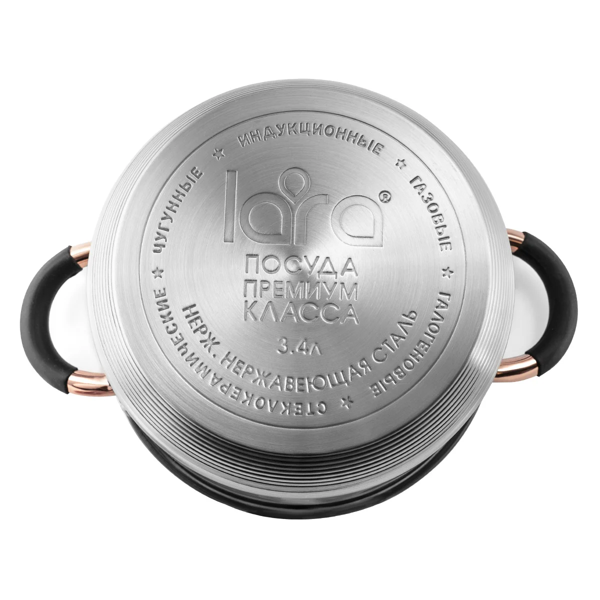 Набор кастрюль LARA эксклюзивной серии «Black and Rose» – это практичная посуда и элегантный предмет интерьера. Внутренняя мерная шкала облегчает процесс приготовления пищи, и вы сможете точно следовать выбранной рецептуре. Корпус из высокоуглеродистой нержавеющей стали AISI201 с комбинированной полировкой. Крышка с паровыпуском из жаропрочного стекла. Стальной обод C-формы для плотной фиксации. Полые ручки на заклепках с покрытием цвета розового золота. Ненагревающиеся черные силиконовые накладки на ручках для вашей безопасности. Девятиступенчатое индукционное капсулированное дно подходит для всех типов плит.