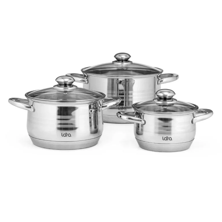 Набор кастрюль LARA серии “SONATA” станет верным помощником на Вашей кухне. Округлый дизайн, зеркальная полировка корпуса с тремя матовыми полосами придают изделиям законченный внешний вид и делают их стильными элементами интерьера. Внутренняя мерная шкала для соблюдения рецептуры. Корпус выполнен из высокоуглеродистой нержавеющей стали AISI201 с комбинированной полировкой. Крышка изготовлена из жаропрочного стекла с паровыпуском, разборной ручкой и стальным ободом C-формы плотно прилегающим к стенкам. Надёжные ненагревающиеся полые ручки на прочных заклёпках. 9-ступенчатое индукционное капсулированное дно подойдёт для всех типов плит.