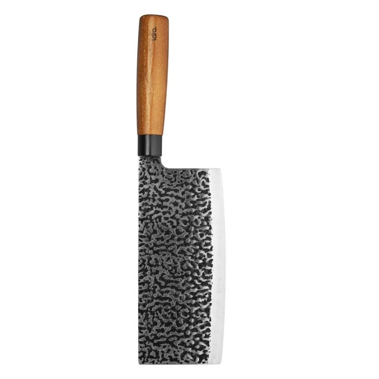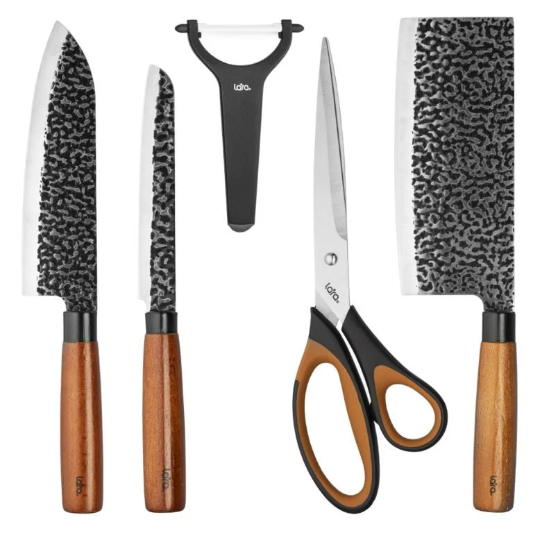 Этот отличный набор ножей LARA в подарочной упаковке собрал в себя инструменты, с помощью которых Вы без труда разделаете мясо или нашинкуете овощи. В комплект входит овощечистка с керамическим лезвием, ножницы с прорезиненными ручками и 3 вида ножей: сантоку, универсальный и топорик. Все ножи выполнены из высокоуглеродистой нержавеющая стали 3Cr14 с финишной отделкой клинка имитирующей следы кузнечного молота. Лезвие с идеальной заточкой режущей кромки долгое время остаётся острым. Выемки на лезвии создают воздушную прослойку при резке. Удобная рукоять из тёмной древесины со стальным чёрным больстером придаёт дизайну ножа завершённый вид.