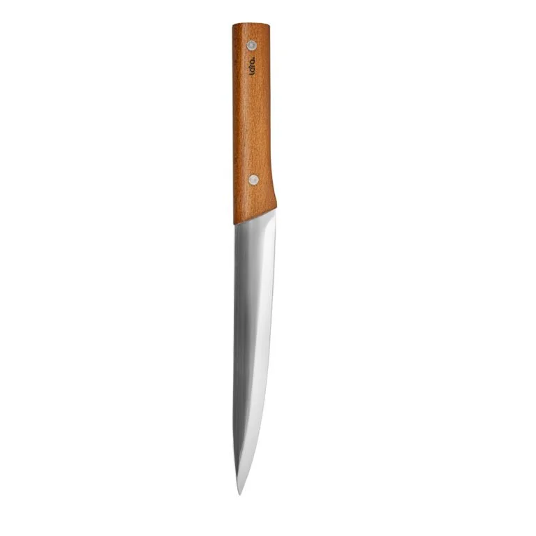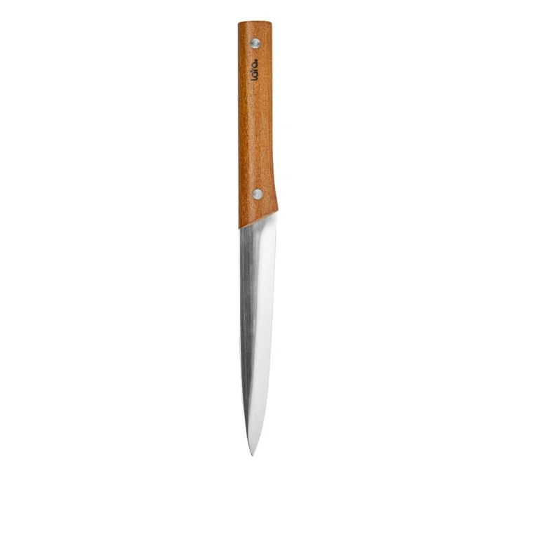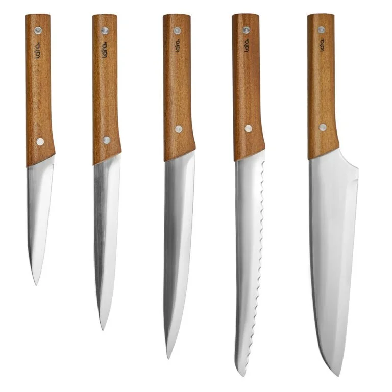 Набор ножей LARA с элегантным внешним видом и непревзойдённым качеством исполнения отлично впишется в интерьер Вашей кухни. В подарочном комплекте собраны 5 предметов: нож для овощей, для нарезки, для хлеба, универсальный и поварской ножи. Рекомендуется ручная мойка. Все ножи выполнены из высокоуглеродистой нержавеющая стали 3Cr14 с финишной отделкой клинка имитирующей следы кузнечного молота. Лезвие с идеальной заточкой режущей кромки долгое время остаётся острым. Выемки на лезвии создают воздушную прослойку при резке. Удобная рукоять из тёмной древесины со стальным чёрным больстером придаёт дизайну ножа завершённый вид.