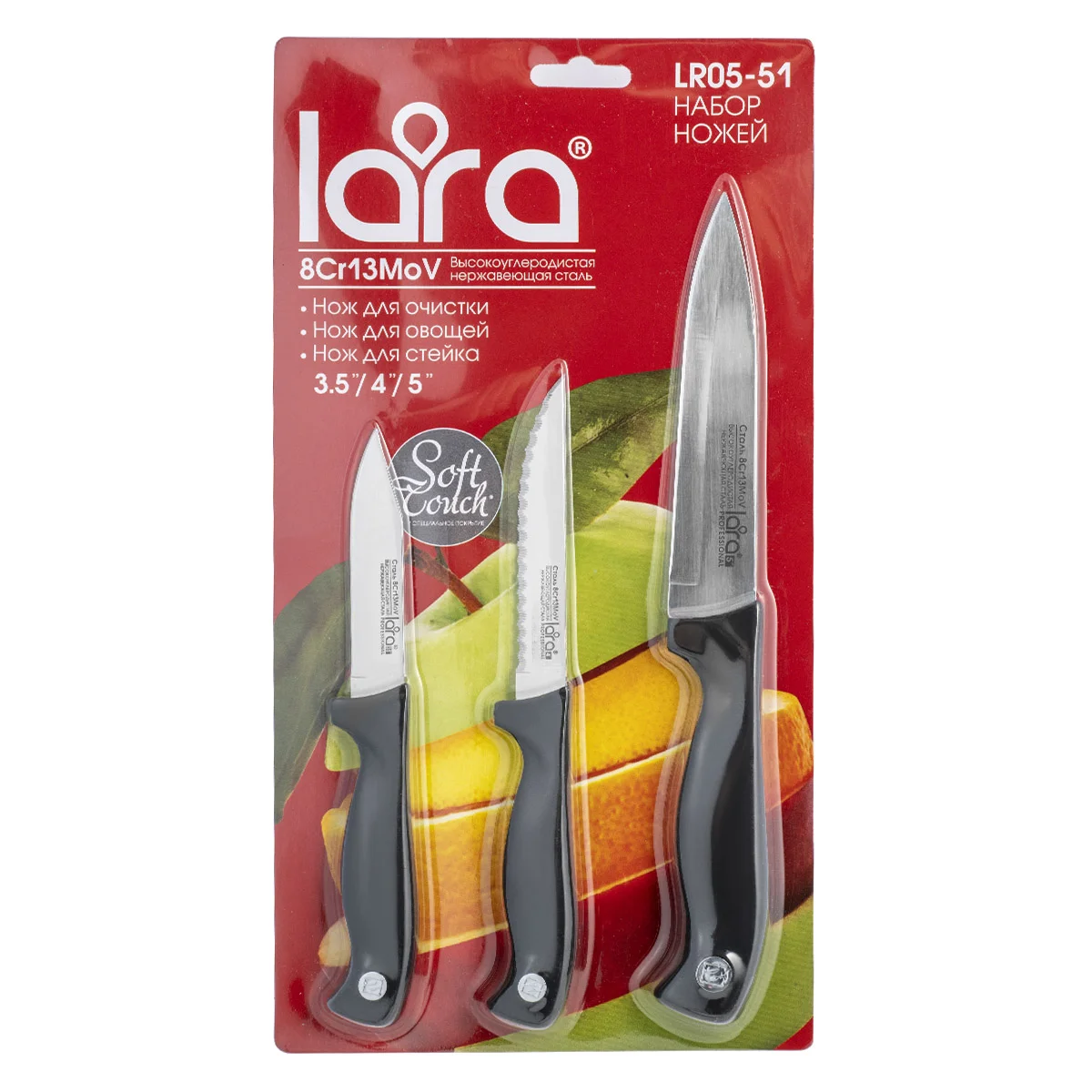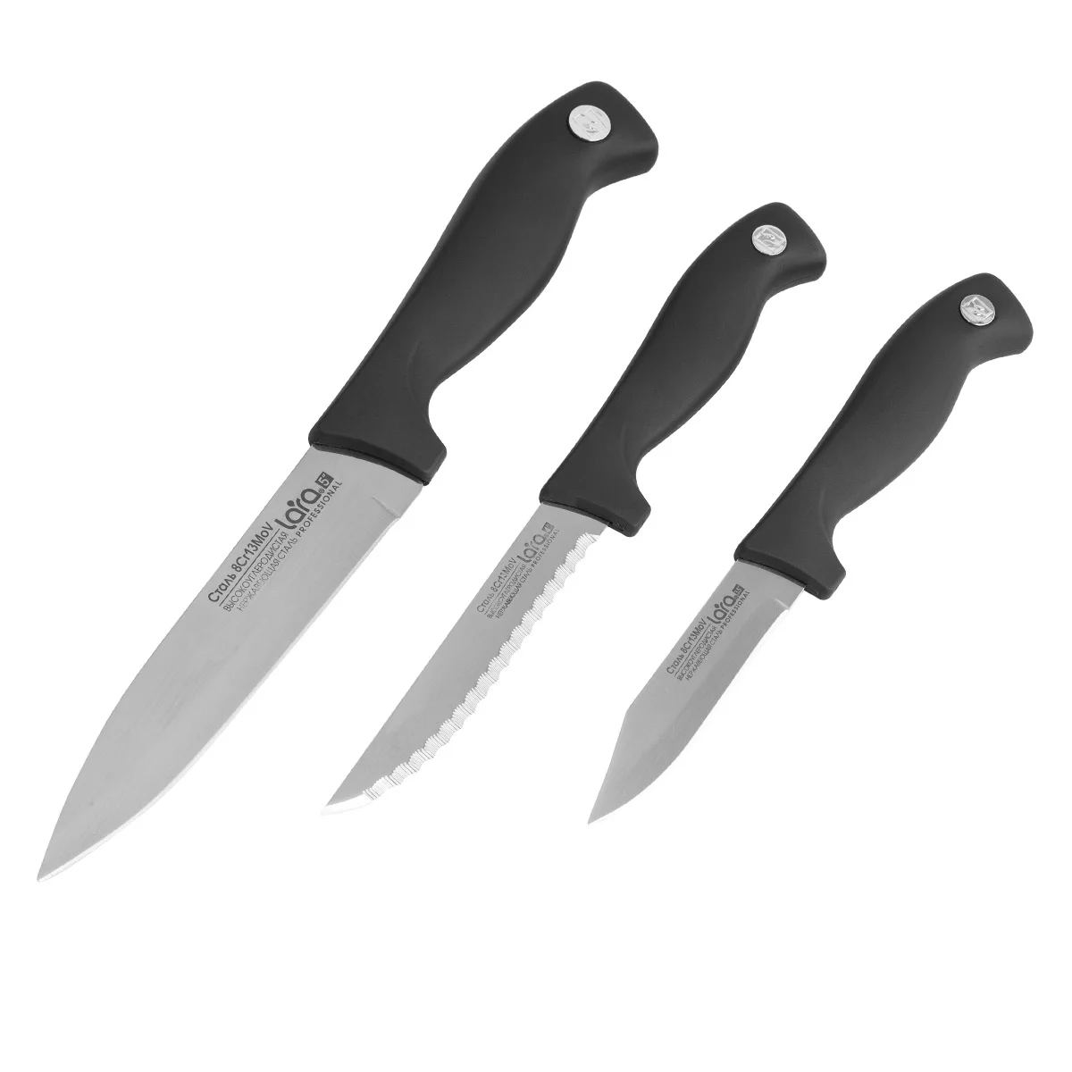 Если вы ищете набор ножей, с помощью которого любая работа на кухне или семейном пикнике станет простой и удобной, то ножи LARA помогут в этом. В комплект входит три вида ножей: для стейка, для овощей и для очистки. Набор отличается остротой клинка, эргономикой и износостойкостью. Материалом для клинков послужила высокоуглеродистая нержавеющая сталь марки 3Cr13 с зеркальной полировкой. Надежная рукоять из пластика черного цвета усилена заклепкой. Нож при нарезке не скользит в руке благодаря прорезиненному покрытию Soft-touch. Лезвие с острой режущей кромкой прослужит долго. Легкая повторная заточка при необходимости. Рекомендуется ручная мойка.