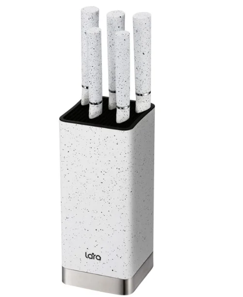 Набор ножей LARA LR05-70 – это универсальный набор 5 в 1 с дополнительной системой хранения. Благодаря подставке занимают мало места и стильно смотрятся на кухне. Ножи идеально сбалансированы, для защиты оснащены больстером между рукоятью и лезвием. Для большего удобства ручки ножей имеют покрытие Soft touch. Устойчивая подставка обеспечивает правильное хранение, благодаря чему ножи долго остаются острыми. В комплекте: подставка 98х220 мм с пластиковыми слотами для бережного хранения, шеф-нож, нож для нарезки хлеба, универсальный нож, нож для очистки, нож для нарезки.