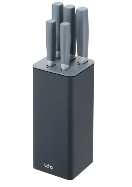 Набор ножей LARA LR05-71 – это универсальный набор 5 в 1 с дополнительной системой хранения. Благодаря подставке занимают мало места и стильно смотрятся на кухне. Ножи идеально сбалансированы, для защиты оснащены больстером между рукоятью и лезвием. Для большего удобства ручки ножей имеют покрытие Soft touch. Устойчивая подставка обеспечивает правильное хранение, благодаря чему ножи долго остаются острыми. В комплекте: подставка 98х220 мм с индивидуальными пластиковыми слотами для бережного хранения, шеф-нож, нож для нарезки хлеба, универсальный нож, нож для очистки, нож для нарезки.