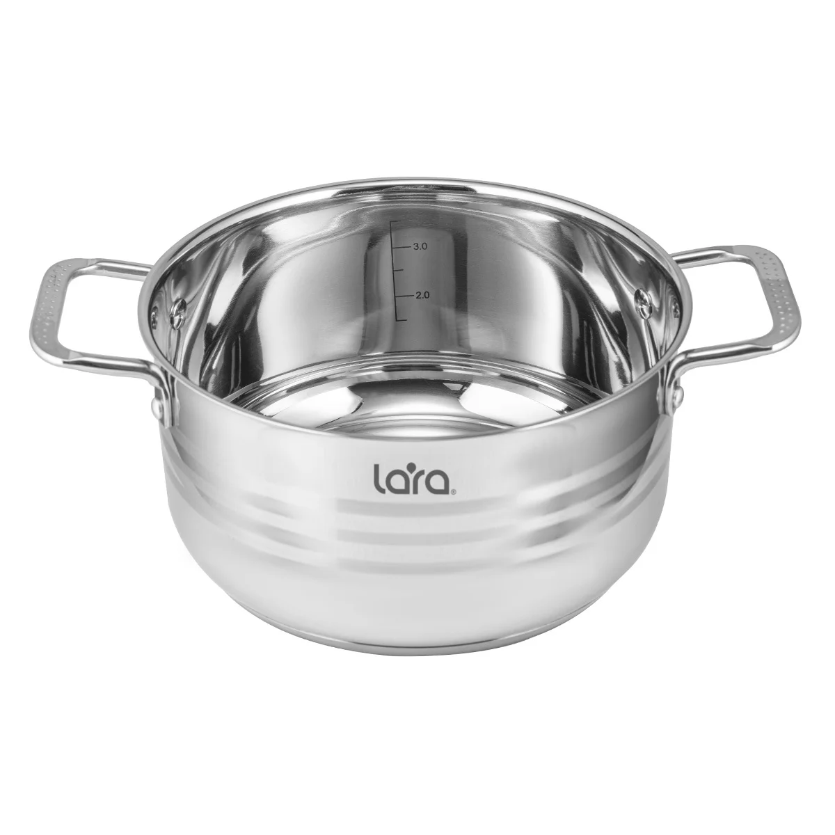 Набор кастрюль LARA серии “STANDART” с сотейником станет верным помощником на Вашей кухне. Зеркальная полировка корпуса с тремя матовыми полосами придают изделиям законченный внешний вид и делают их стильными элементами интерьера. Внутренняя мерная шкала для соблюдения рецептуры. Кастрюли произведены из высокоуглеродистой нержавеющей стали AISI201. Крышка изготовлена из жаропрочного стекла с паровыпуском, стальной ненагревающейся ручкой и ободом G-формы, плотно прилегающим к стенкам. Полые ненагревающиеся ручки на прочных заклёпках. Толстое индукционное капсулированное дно подойдёт для всех типов плит. Можно мыть в посудомойке.