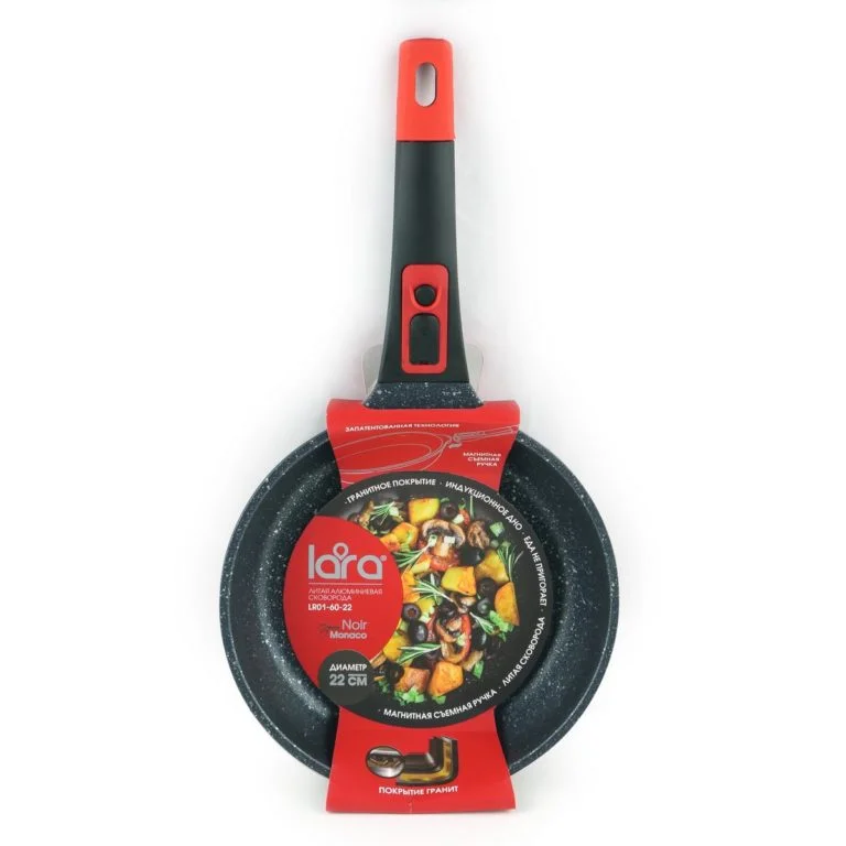 Современная линейка сковородок LARA серии “MONACO NOIR” – это практичность и комфорт, дизайн и актуальное цветовое решение для интерьера. Ключевой особенностью серии является устойчивое к царапинам прочное внутреннее трёхслойное антипригарное покрытие GRANIT с мраморной крошкой и внешнее жаропрочное покрытие. Для производства были подобраны только экологически чистые материалы. Корпус выполнен из литого алюминия с отличными теплопроводными свойствами. Удобная съёмная магнитная ручка из бакелита с мягким прорезиненым покрытием. Точечное индукционное дно подходит ко всем типам плит. Возможно использование в духовке. Петля для подвешивания.