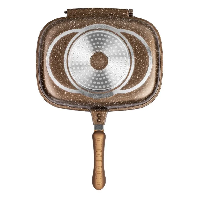 Двойная алюминиевая сковорода-гриль LARA серии «Choco» – это по-настоящему хороший подарок каждому увлеченному кулинару. Она прекрасно подойдет для приготовления сочных стейков, овощей гриль, цыпленка табака и множества других блюд. Антипригарное мраморное покрытие надежно защищает дно и стенки от повреждений. В сложенном состоянии сковорода прекрасно сохраняет температуру и доводит блюдо до готовности. На корпусе есть пароотвод. Силиконовый ободок защищает от вытекания жидкости, а бакелитовые ручки с покрытием Soft-Touch и магнитным замком надежно фиксируют крышку. Точечное индукционное дно подходит для любых поверхностей. Два дополнительных силиконовых ободка в комплекте.