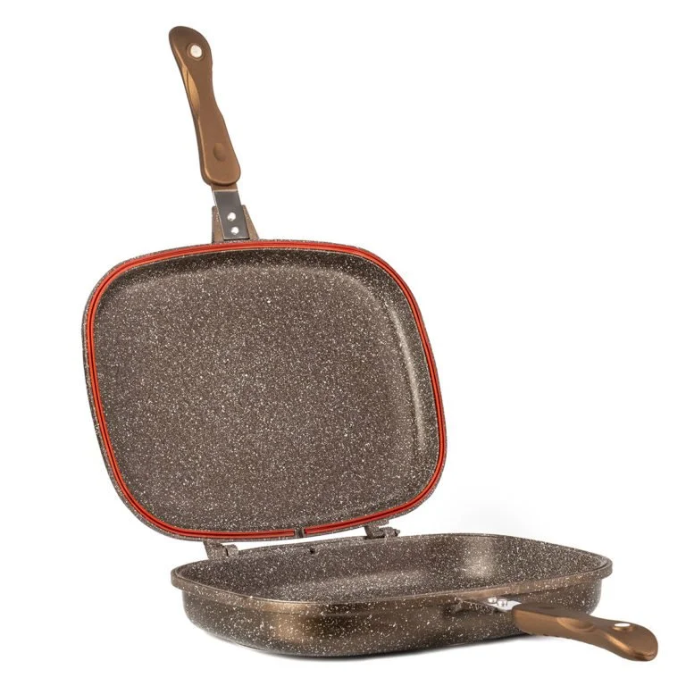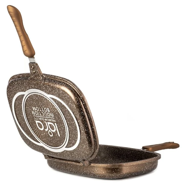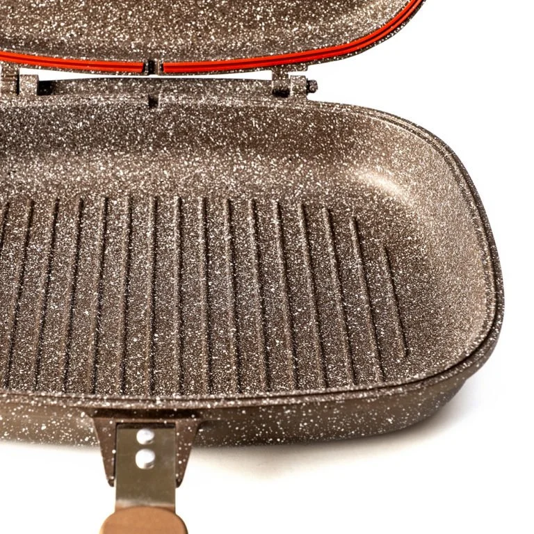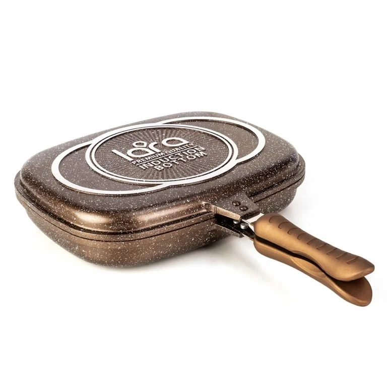 Алюминиевая двойная сковорода-гриль LARA серии “CHOCO” – прекрасный подарок каждому увлечённому кулинару. Она прекрасно подойдёт для приготовления сочных стейков, овощей гриль, цыплёнка табака и множества других блюд. Антипригарное мраморное покрытие сделает приготовление комфортным. В сложенном состоянии сковорода прекрасно сохраняет температуру и доводит блюдо до кондиции. Силиконовый ободок защищает от вытекания жидкости, а бакелитовые ручки с софт-тач покрытием и магнитным замком надёжно фиксируют крышку. Точечное индукционное дно подходит для любых поверхностей. Две дополнительные резиновые прокладки в комплекте. Пароотвод на корпусе.