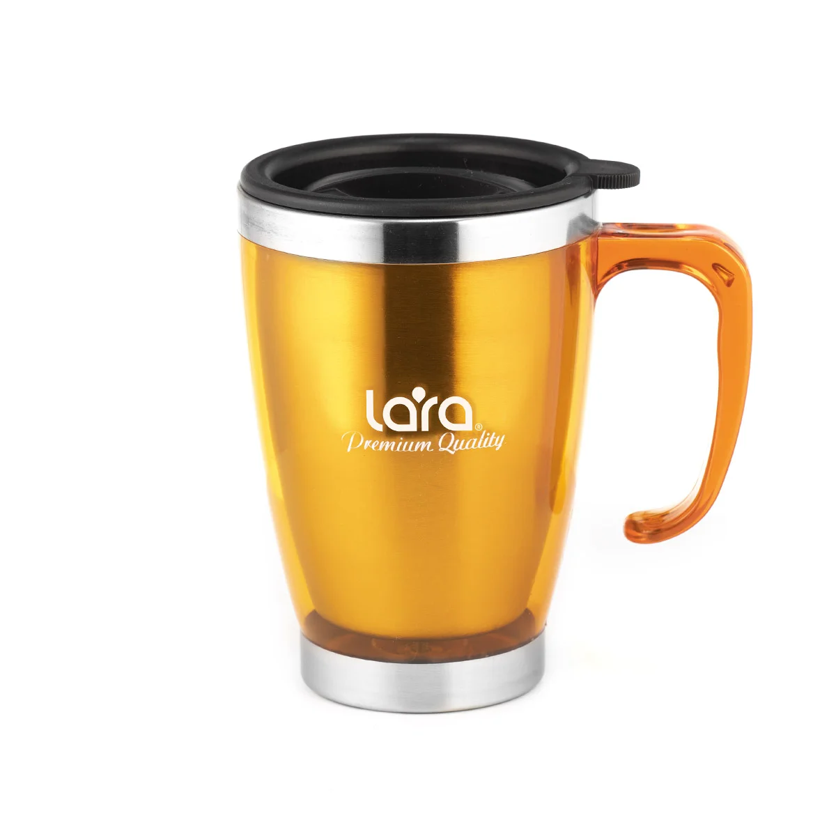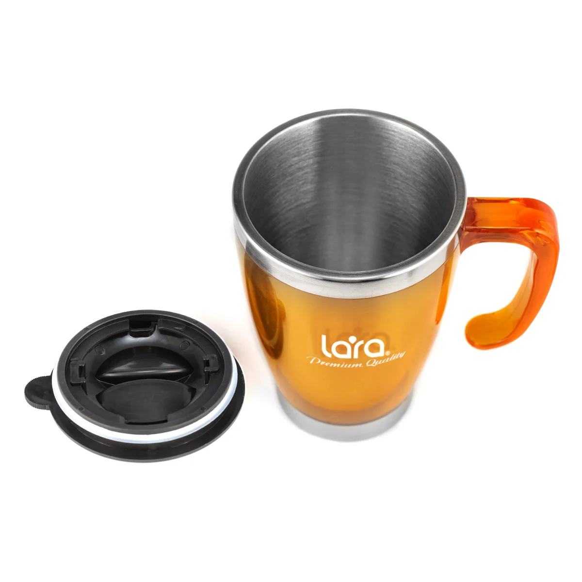 Удобная и яркая термокружка LARA LR04-38 с ручкой подходит для горячих и холодных напитков. Благодаря двойным стенкам напиток дольше сохраняет температуру. Конструкция крышки позволяет без труда снять ее с кружки. Колба изготовлена из нержавеющей стали.