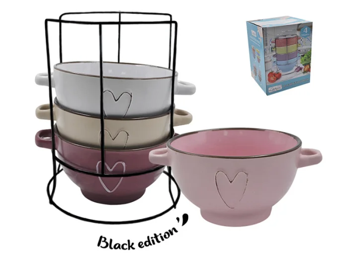 Набор выполнен из керамики и подойдёт для подачи горячих бульонов, супа, холодца и других блюд. Бульонницы компактно располагаются на подставке и не занимают много места при хранении на кухне.